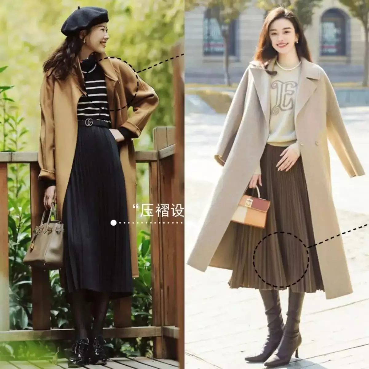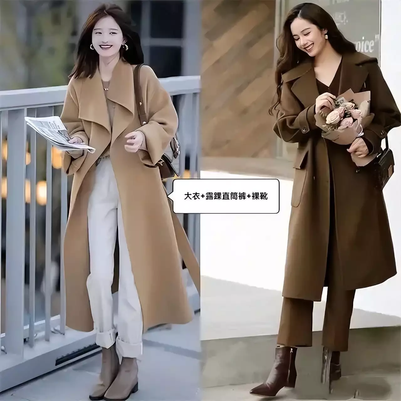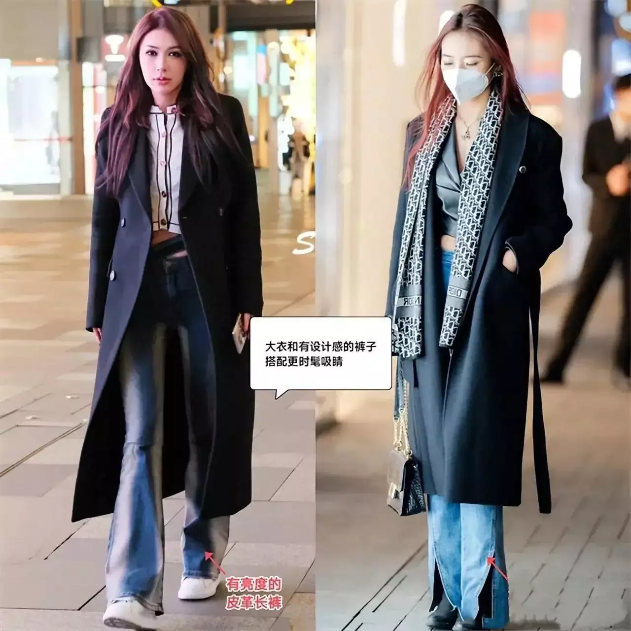 就像下面左边这套创意造型里的裤子,一眼就能看出面料柔软,而且是阔腿裤版型,不仅遮肉,和大衣外套搭配起来还很有量感,展现出女神范。高个子、骨架大的女生可以参考这种穿搭。
