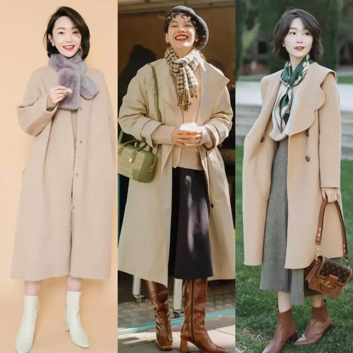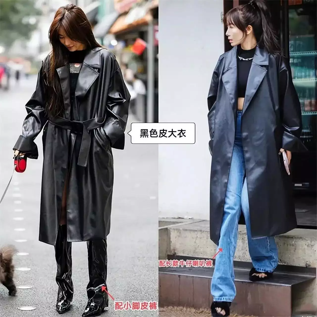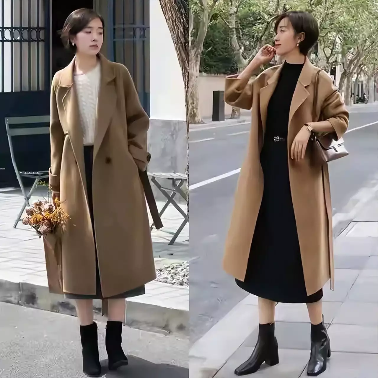 就像下面左边这套创意造型里的裤子,一眼就能看出面料柔软,而且是阔腿裤版型,不仅遮肉,和大衣外套搭配起来还很有量感,展现出女神范。高个子、骨架大的女生可以参考这种穿搭。