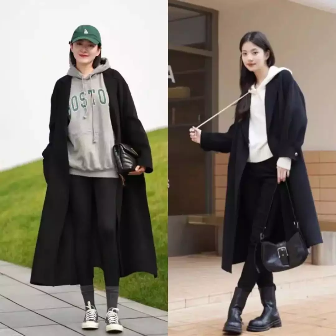 瞧瞧下面这两位素人博主的创意造型,满满的运动风。一件黑色大衣外套,内搭灰色卫衣,下半身配深灰色鲨鱼裤,脚踩帆布鞋,这样的穿搭让穿着者尽显少女感。