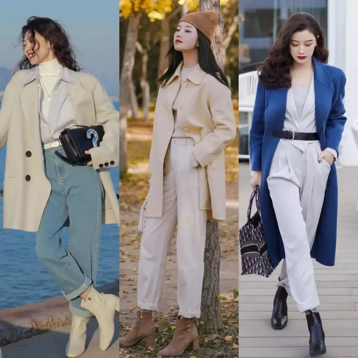 就像下面这件白色大衣搭配牛仔烟管裤,脚踩白色短靴;或者蓝色大衣外套搭配白色圆碗西裤,脚踩黑色短靴,都能让穿搭者变得时髦好看。