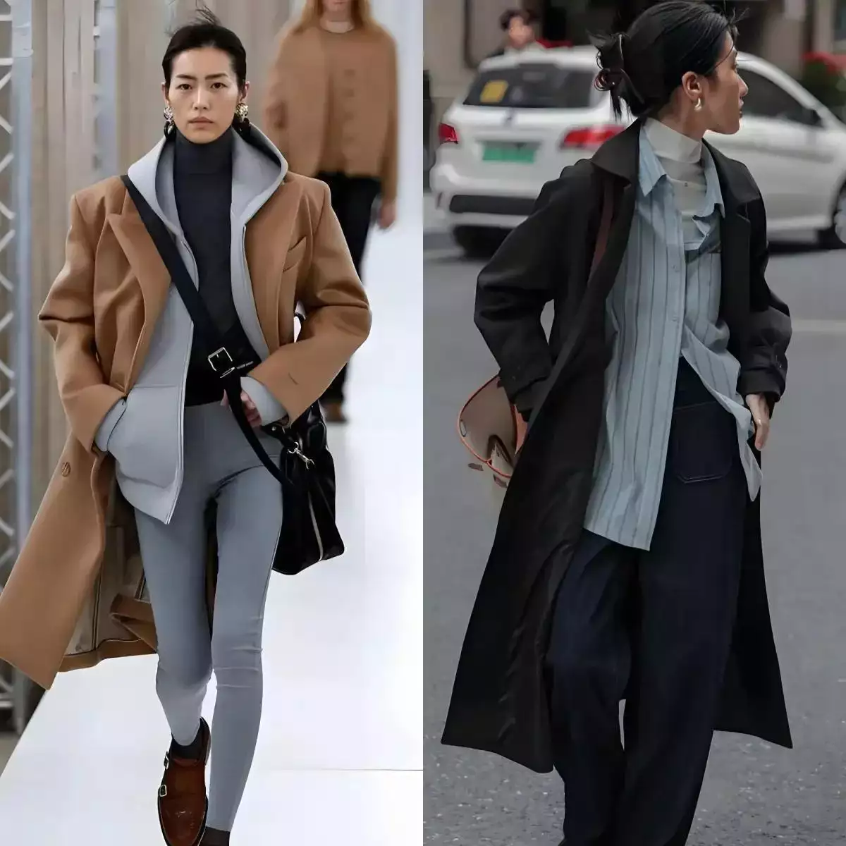 比如下面左边这套穿衣造型,就没什么精致时髦感,尤其是那条灰色紧身裤,把腿型缺陷都暴露出来了,还不如右边那套穿搭呢!