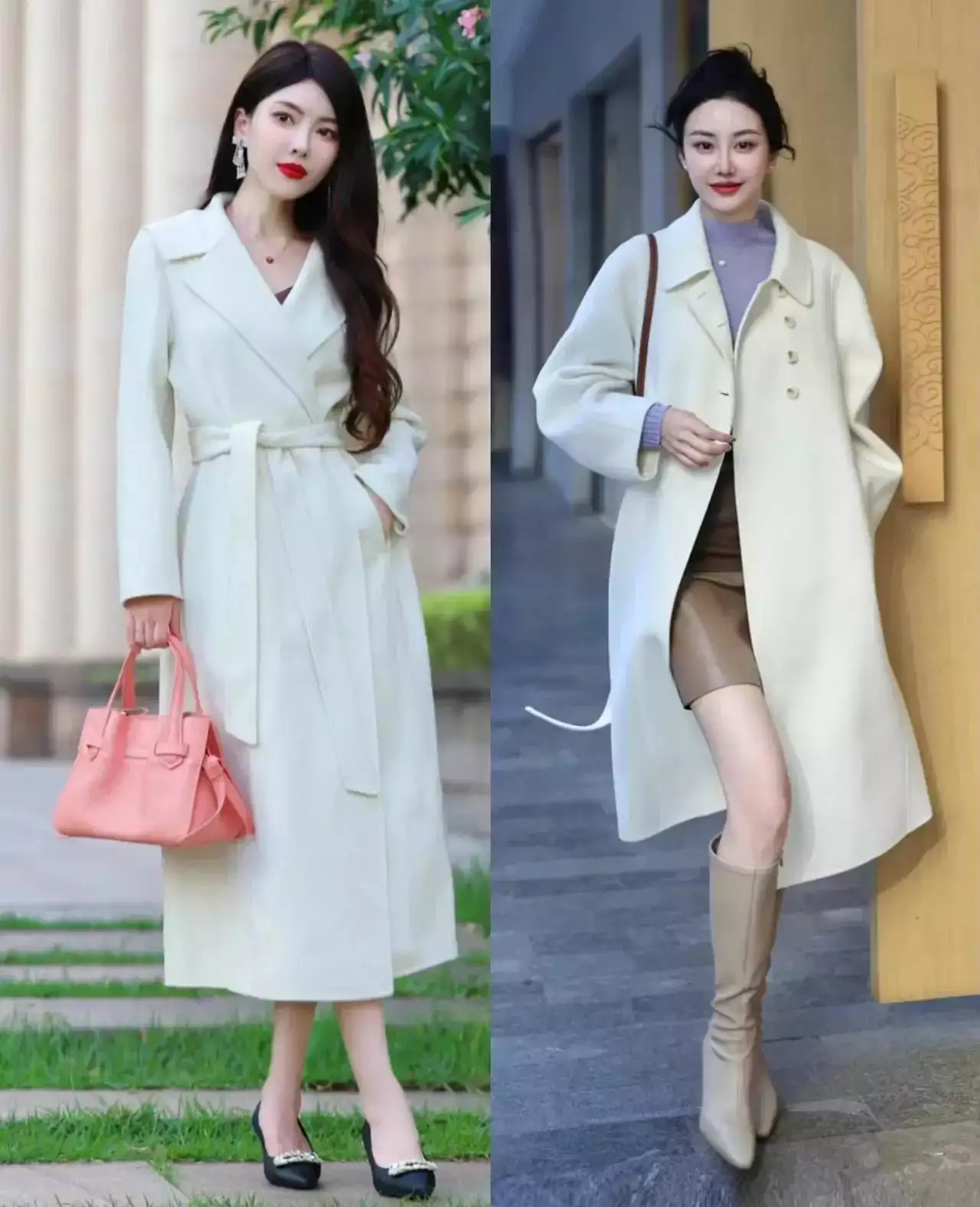 裙子的版型不同,穿出来的效果也大不一样哦。比如下面这两位达人的穿衣风格,一个用短裙和中筒靴搭配白色大衣外套,另一个用半身裙和浅口高跟鞋搭配白色大衣外套,散发的气质一个是活力四射,一个是成熟稳重。