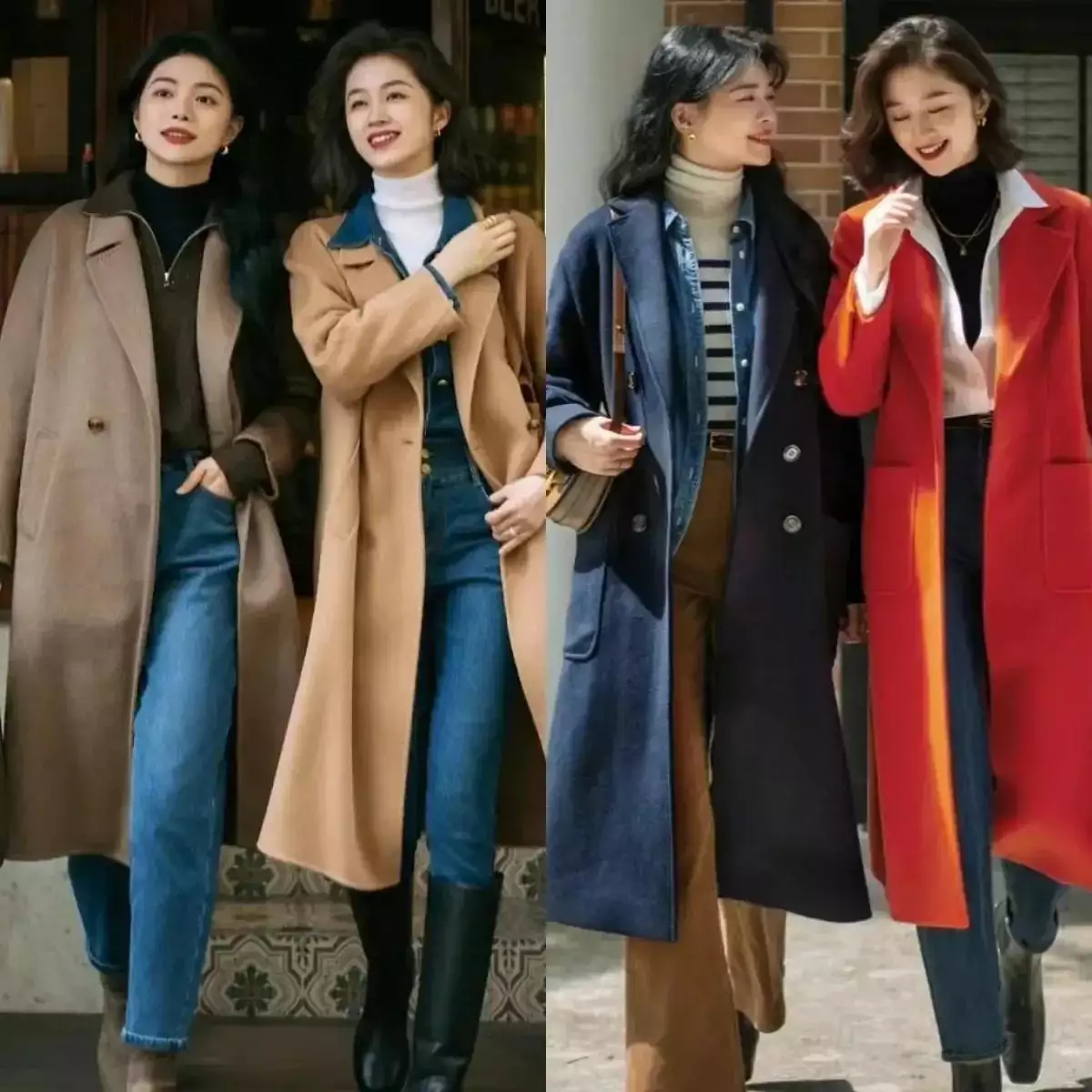 再看下面这两位达人的穿搭,比较适合我们普通大众。一件深灰色大衣外套,内搭蓝色衬衫,再叠穿咖色毛衣,下半身选黑色烟管裤,脚上踩中筒靴。这一身不管是上衣还是裤子,都是宽松版型,能更好地修饰身材。