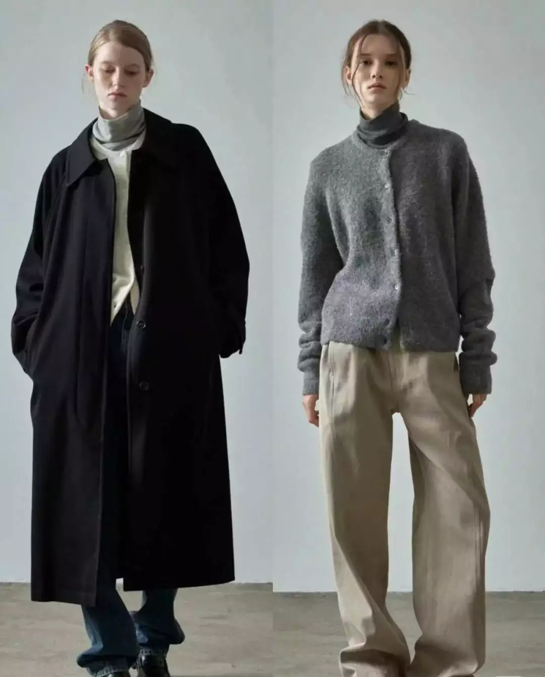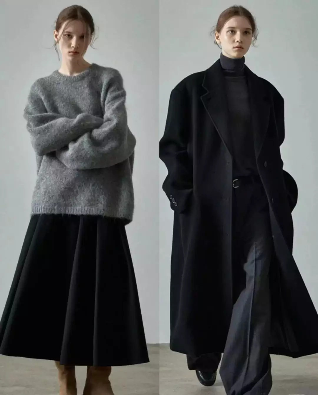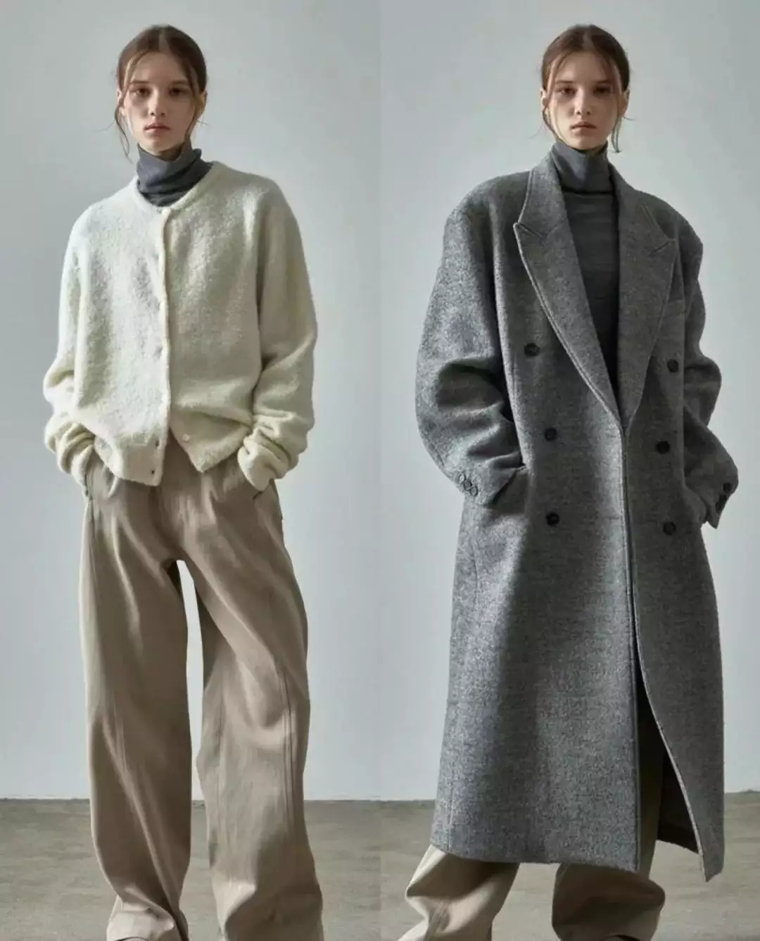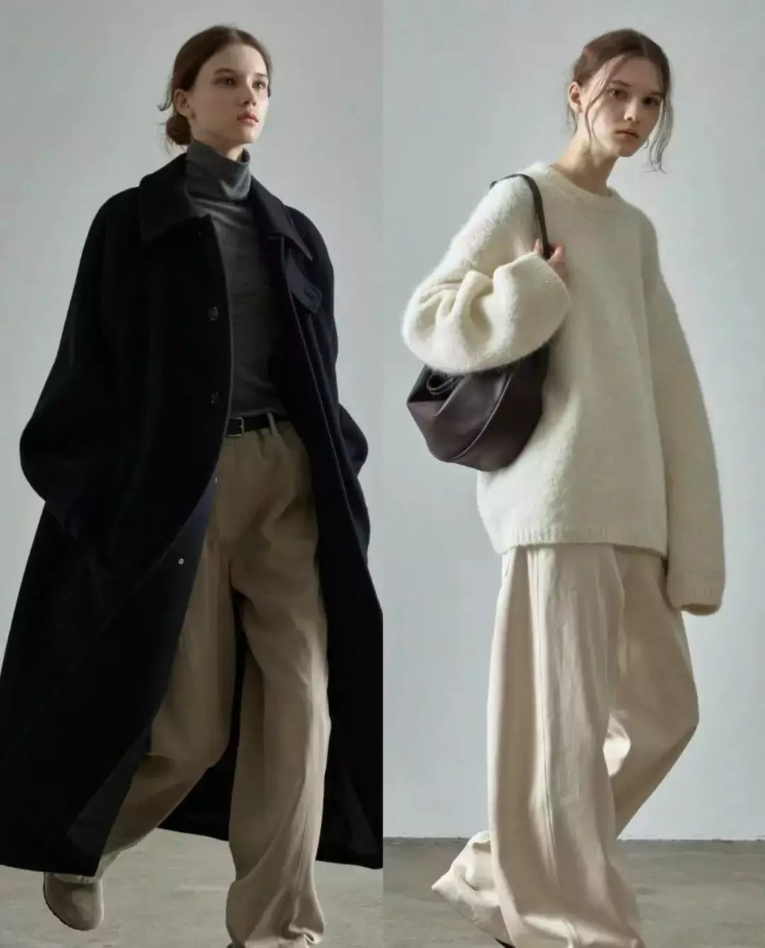 简约的白色毛衣搭配黑色阔腿裤,轻松营造出优雅气质。而灰色大衣内搭浅灰色高领毛衣,下装选择深灰色卫裤,同色系搭配展现出层次感与高级感。