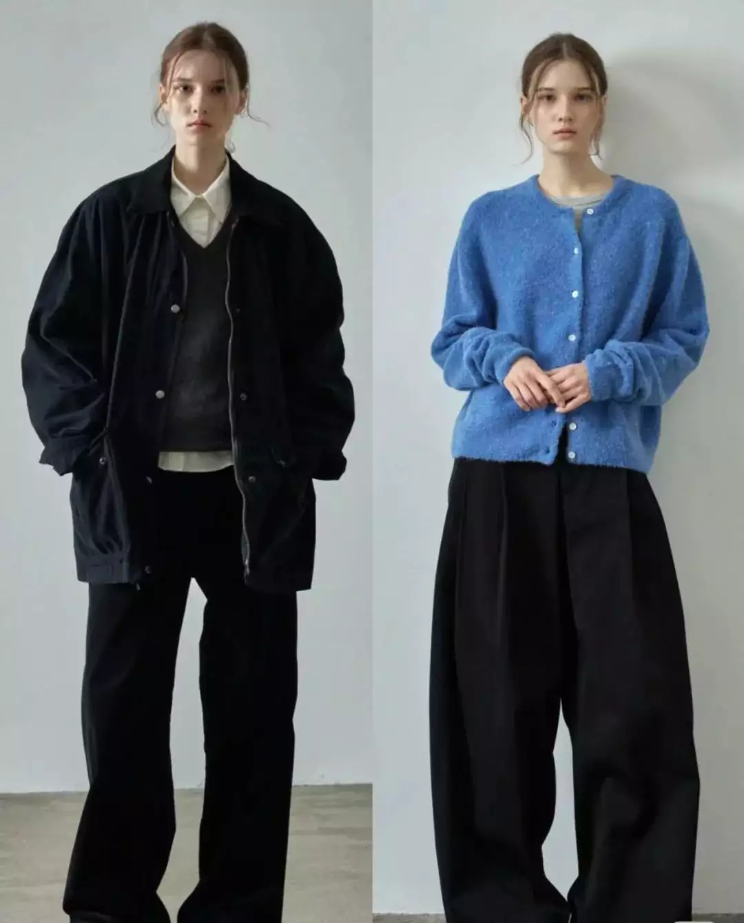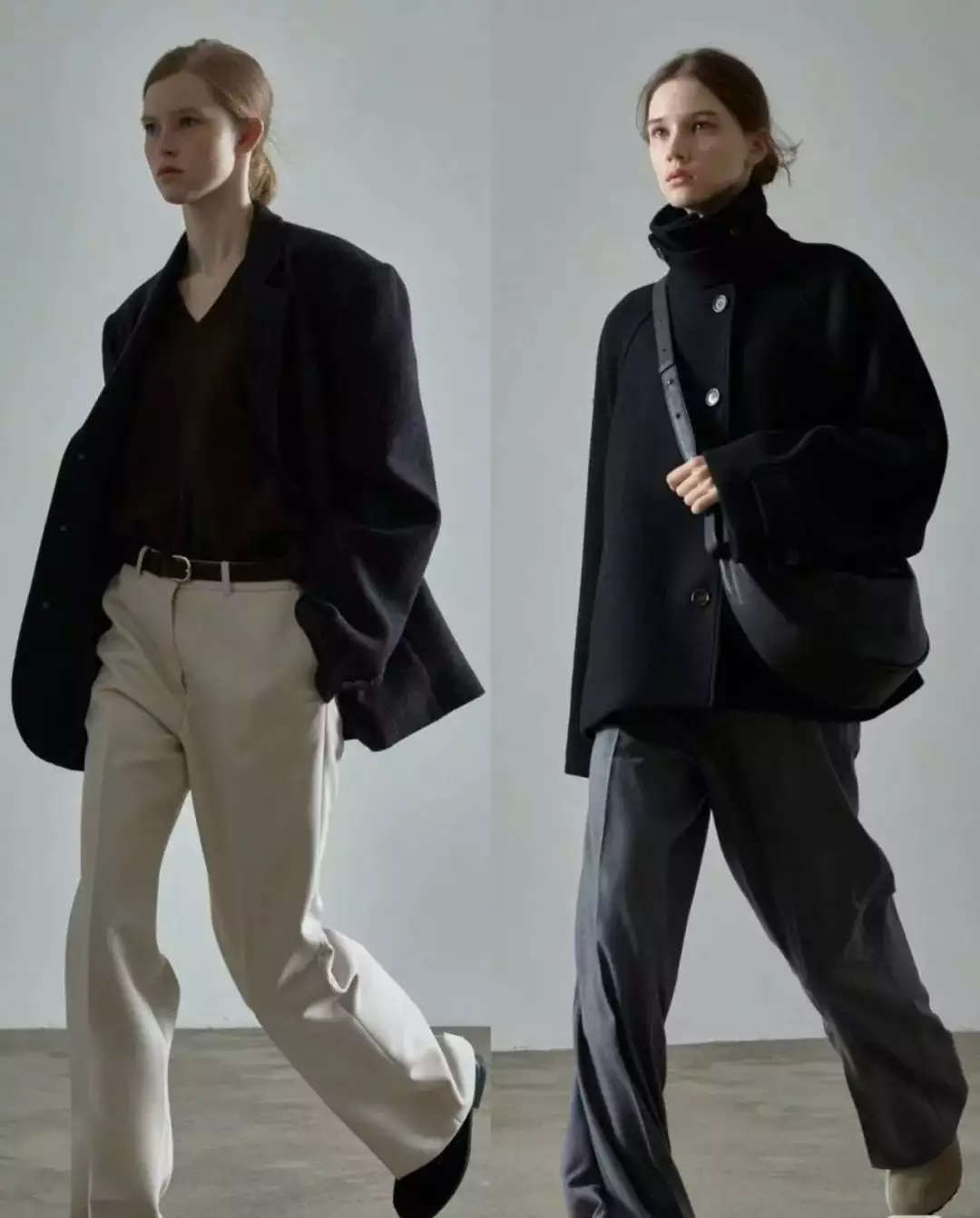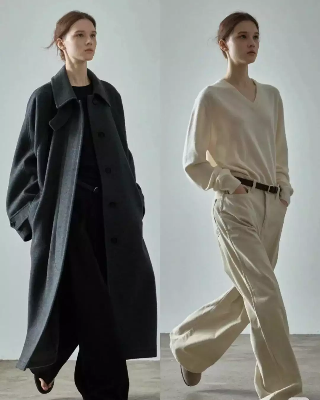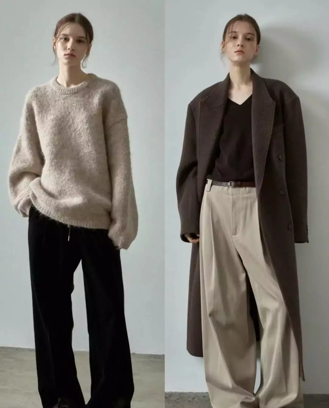 简约的白色毛衣搭配黑色阔腿裤,轻松营造出优雅气质。而灰色大衣内搭浅灰色高领毛衣,下装选择深灰色卫裤,同色系搭配展现出层次感与高级感。