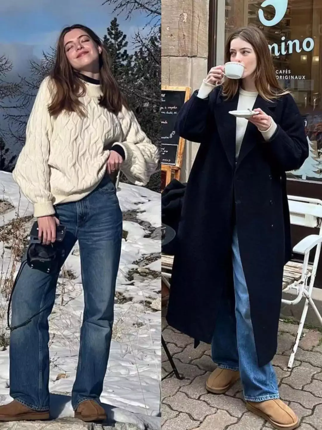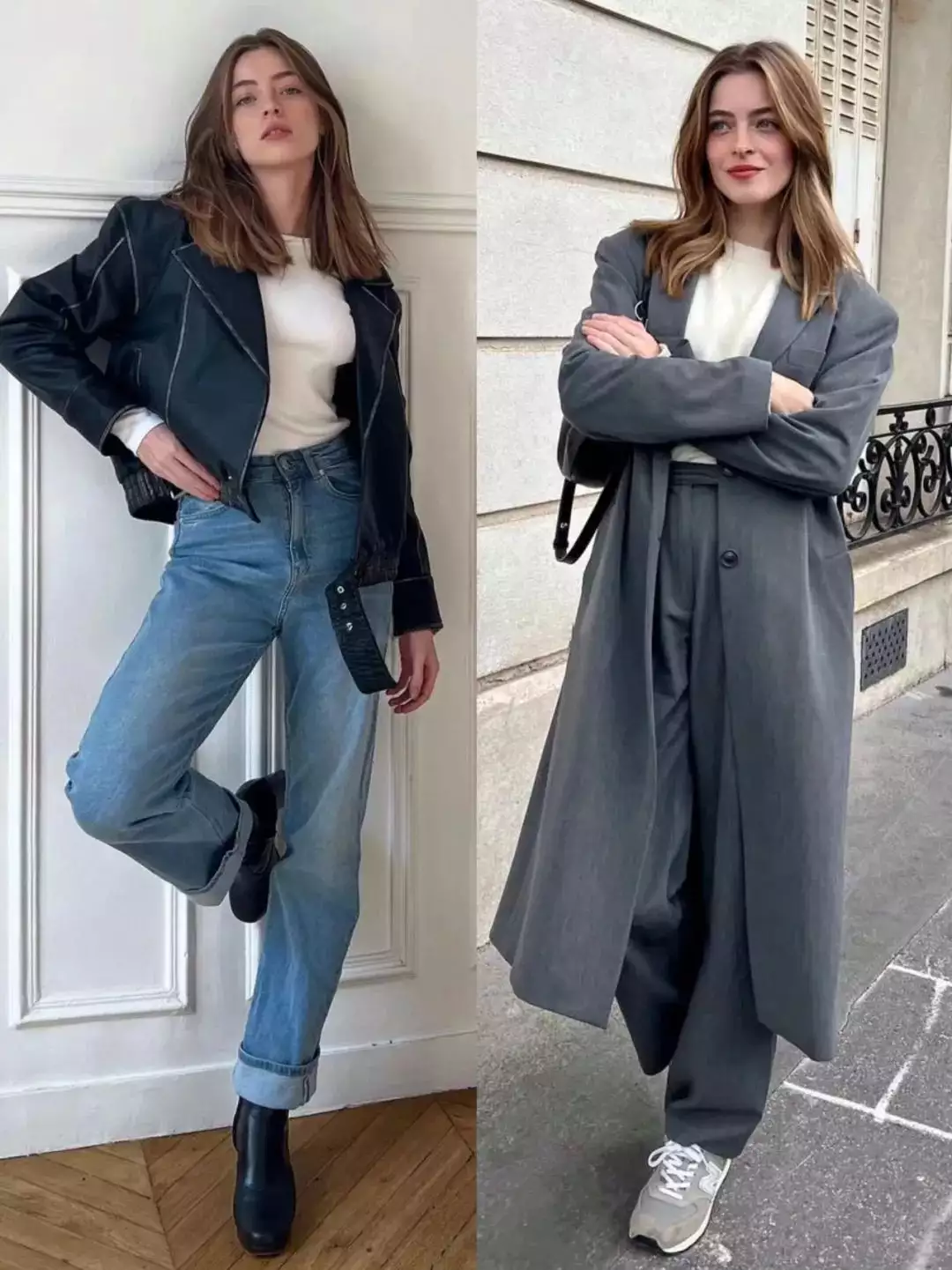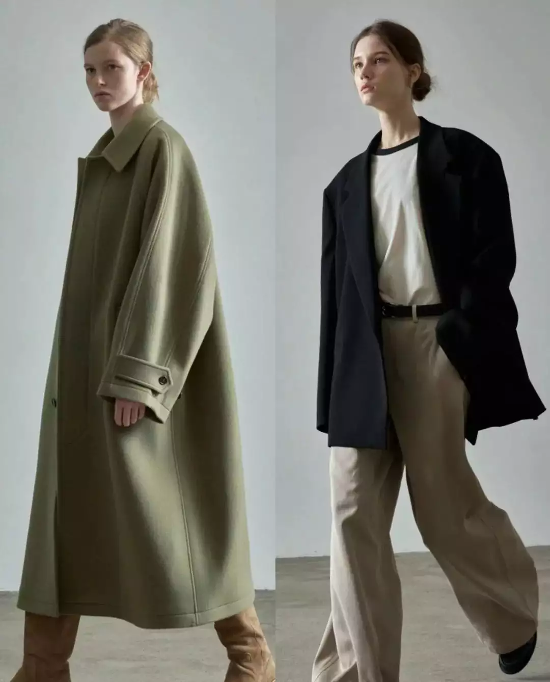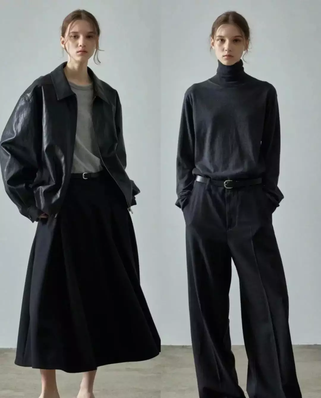 简约的白色毛衣搭配黑色阔腿裤,轻松营造出优雅气质。而灰色大衣内搭浅灰色高领毛衣,下装选择深灰色卫裤,同色系搭配展现出层次感与高级感。