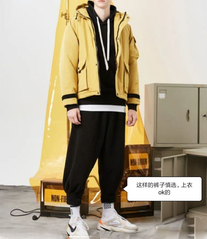 裤子也不要太过嘻哈风,下半身视觉面积太大,会导致重心降低,显矮。