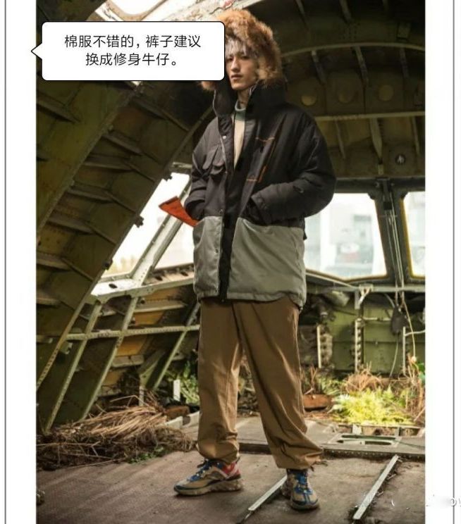 穿中长款棉服时切记“上松下紧”原则,裤装不要太宽松,易显拖沓,选择较为修身的工装或牛仔裤,比较利落。