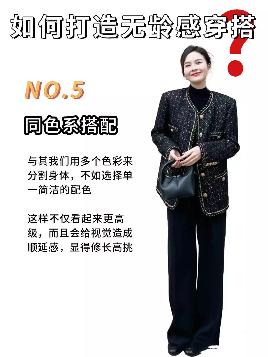 打造无龄感穿搭,还有一个重点,就是利用色系的延伸、打造出简约又高级的美。比如黑色系的搭配,就会更加高级、显得身材修长高挑。