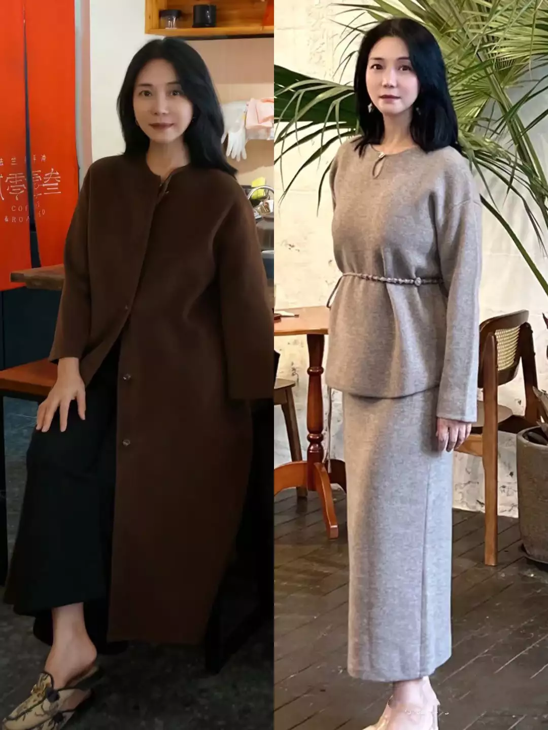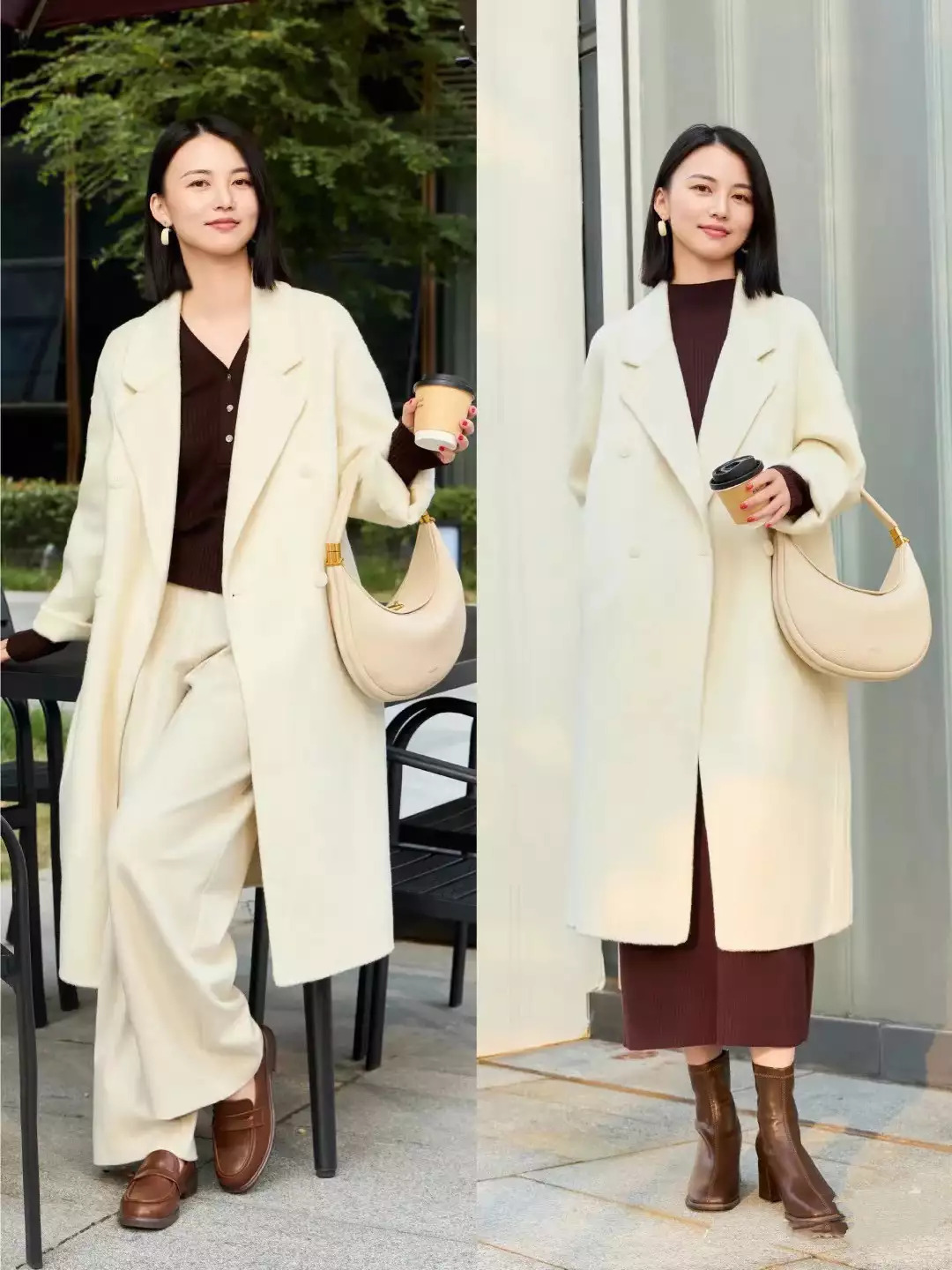 翻领大衣、与阔腿裤、针织裙都是很好的组合。这种高级感配色,真的是大方又显气质。白色翻领毛衣,配上棕色系大气又温柔。