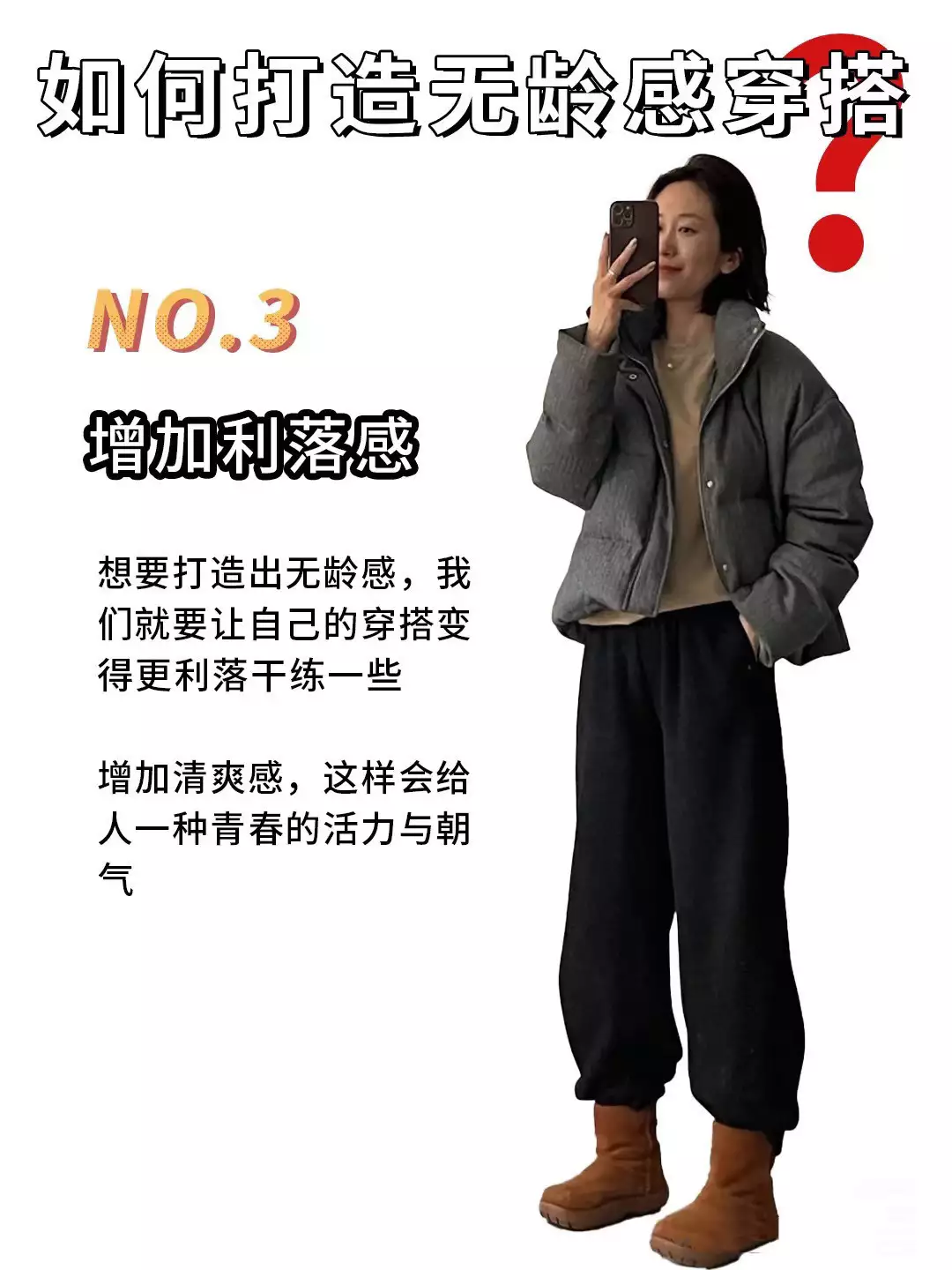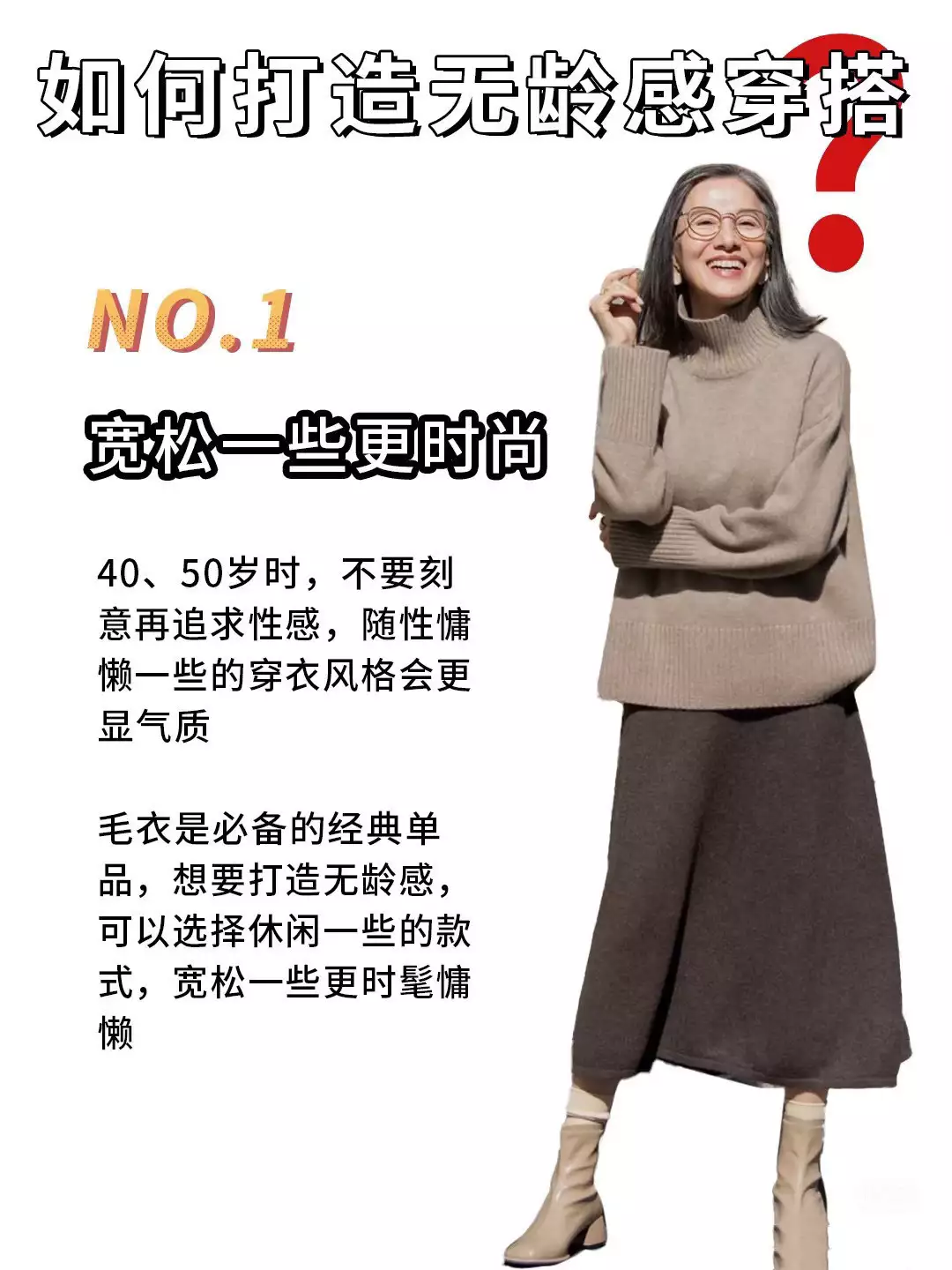 无龄感穿搭,视觉上不会有紧绷、压抑感。我们可以尝试利用休闲舒适的单品、打造出更时尚高级的元素。