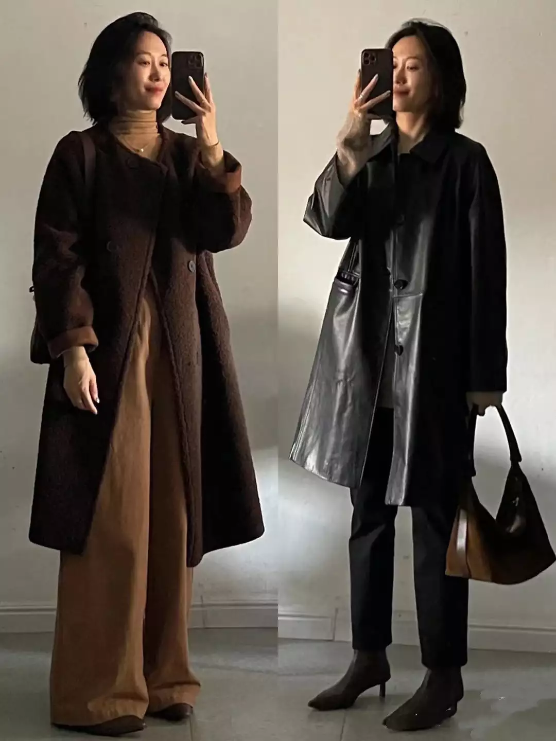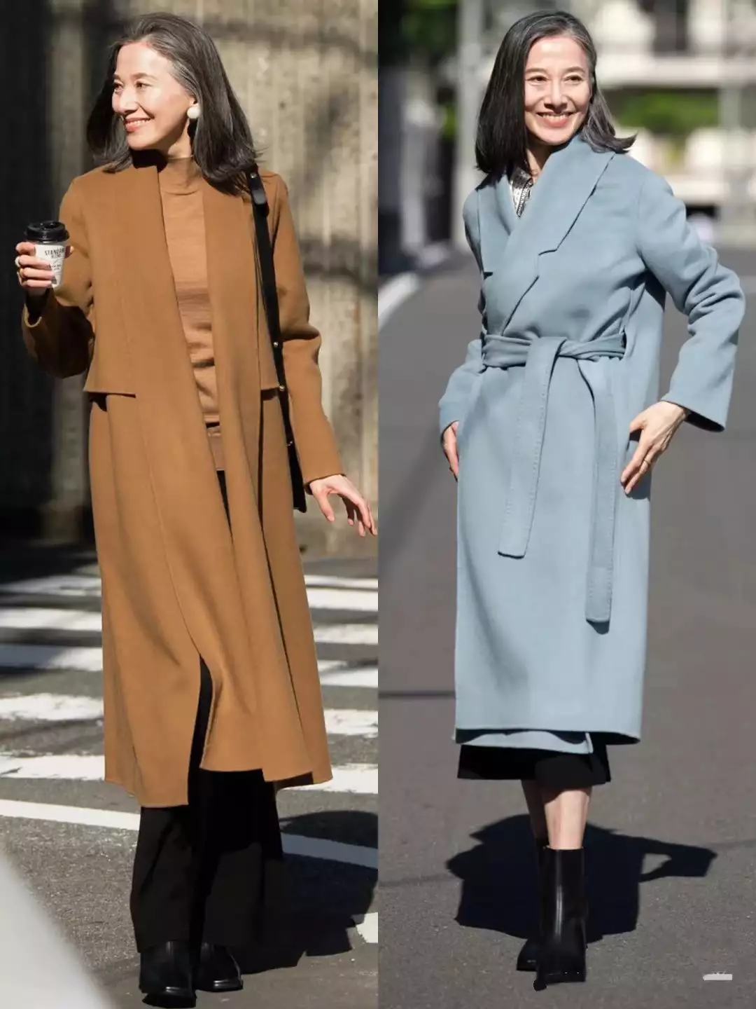 长款大衣+阔腿裤/半身裙的组合,一个大方利落、一个优雅娴静。这种黑色阔腿裤、可以配黑色高跟鞋,简洁又显腿长。