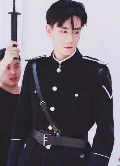 胡一天本身就是一个非常暖心的大哥哥,身材高挑的他身穿一袭黑色系列的制服,腰间的皮带衬托他的腰围很是纤细,整体感觉帅气十足!