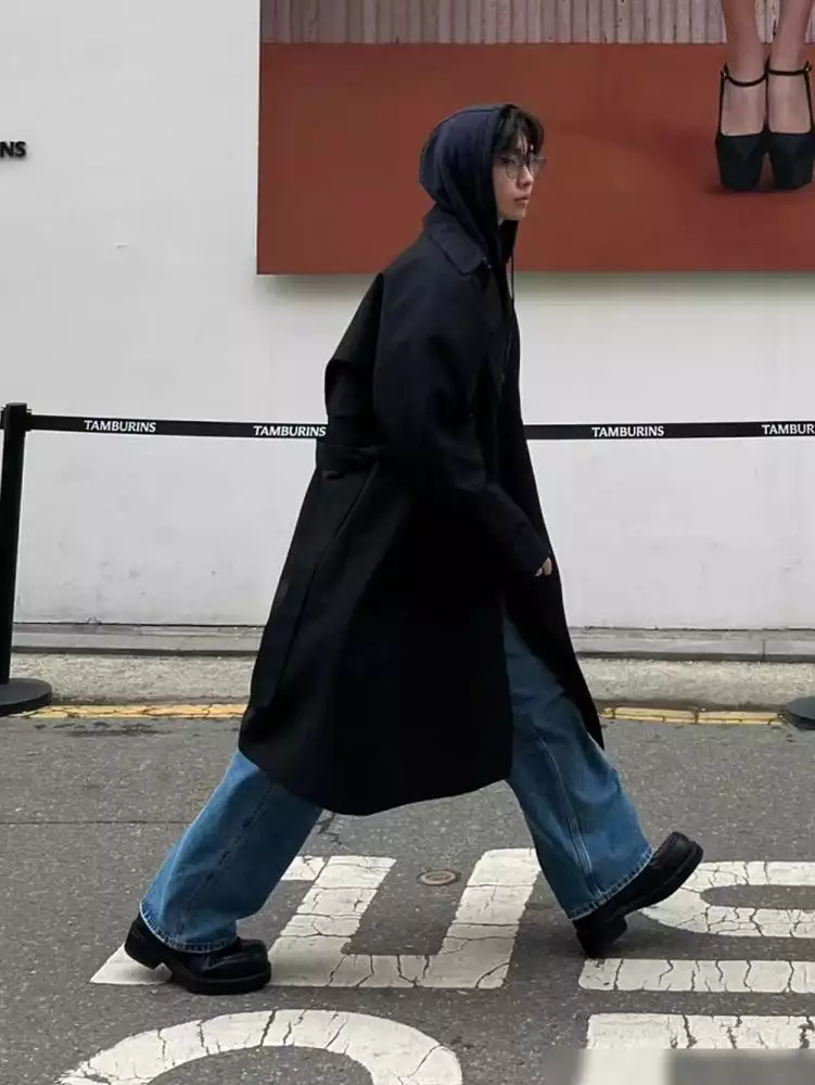 如果想要尝试这种搭配组合,建议你选择一件黑色的大衣,再配上一件纯色或者设计感十足的连帽卫衣,内外之间可以形成鲜明的对比,从而产生强烈的视觉冲击感。