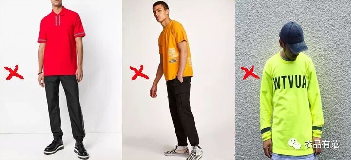 配色上可以用一些亮色的饰边或者图案印花,特别是选择黑色T恤的时候,切忌穿着一码黑的T恤,可以有好看的印花或者撞色的领边和袖边。(如下图)