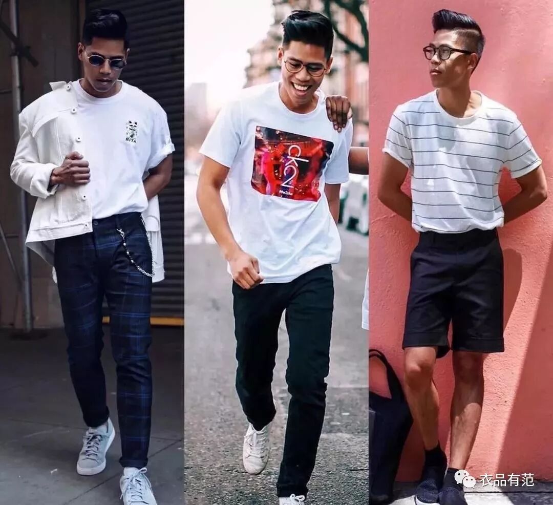 不要以为皮肤黑就不能穿了,穿上白tee会显得干净利索不少。家中应该常备的黑白tee就不用我说了,黑皮肤的男生出门不二之选。