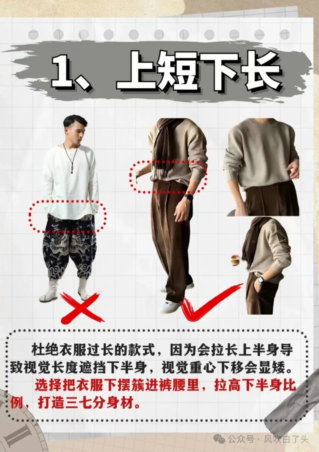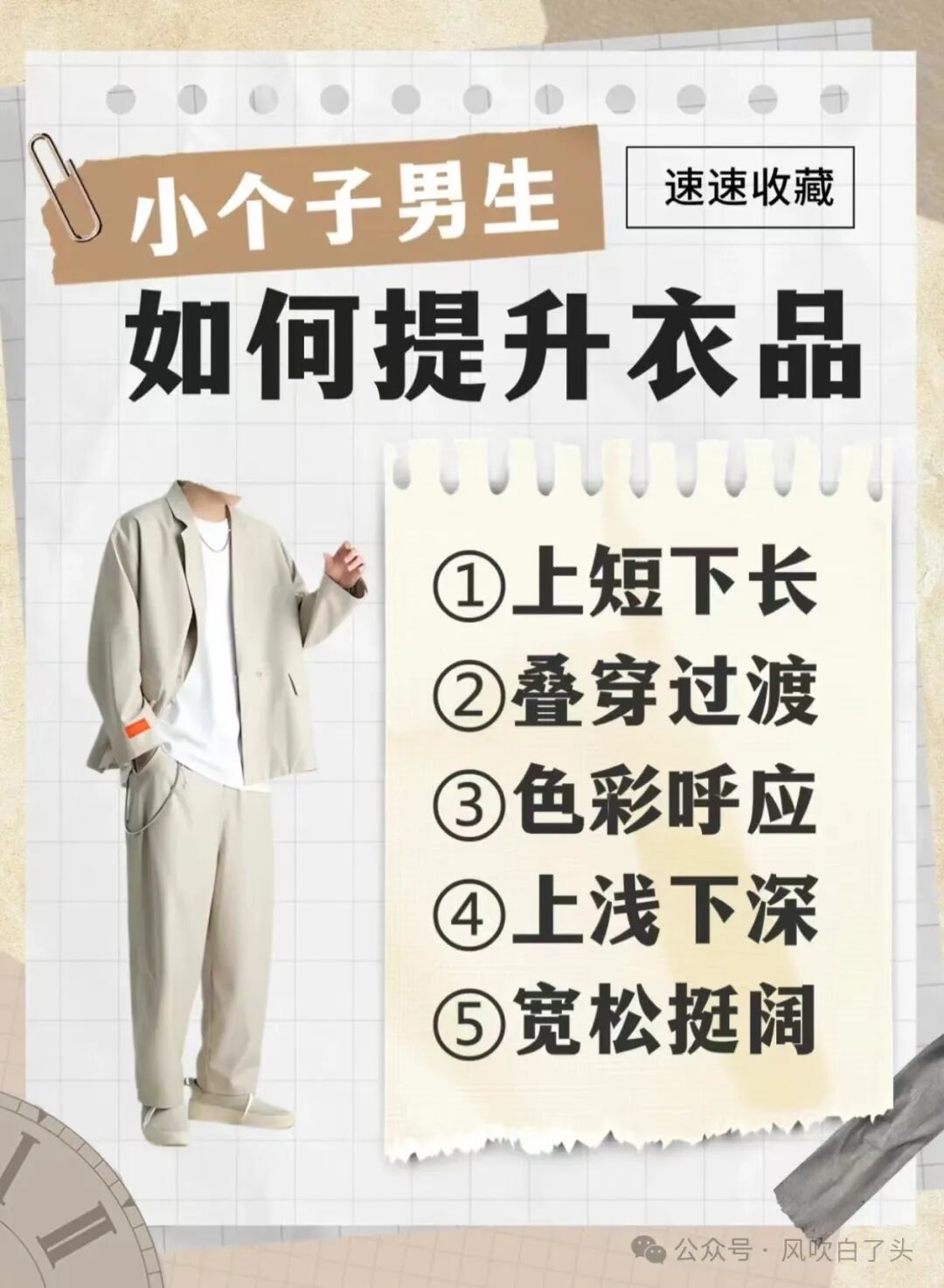 综上所述,小个子男生要提升衣品,需要掌握上短下长、叠穿过渡、色彩呼应、上浅下深和宽松挺阔等技巧。这些技巧可以帮助小个子男生展现自信和魅力,营造出更加高挑、修长的身材比例。同时,要注意选择合适的尺码和裤型,注重细节和层次感,利用颜色对比等技巧来提升整体造型的质感。