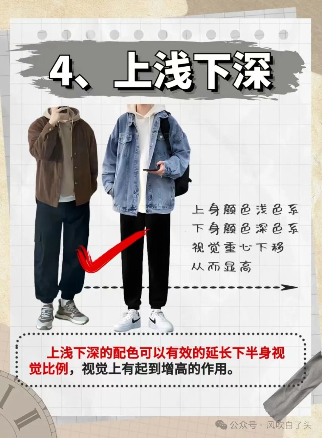 上浅下深的颜色搭配技巧适合小个子男生。选择浅色系的上衣,如白色、浅蓝色等,搭配深色系的裤子或裙子,如黑色、深蓝色等。这样可以营造出更加轻盈的视觉效果,使整体造型更加清爽。