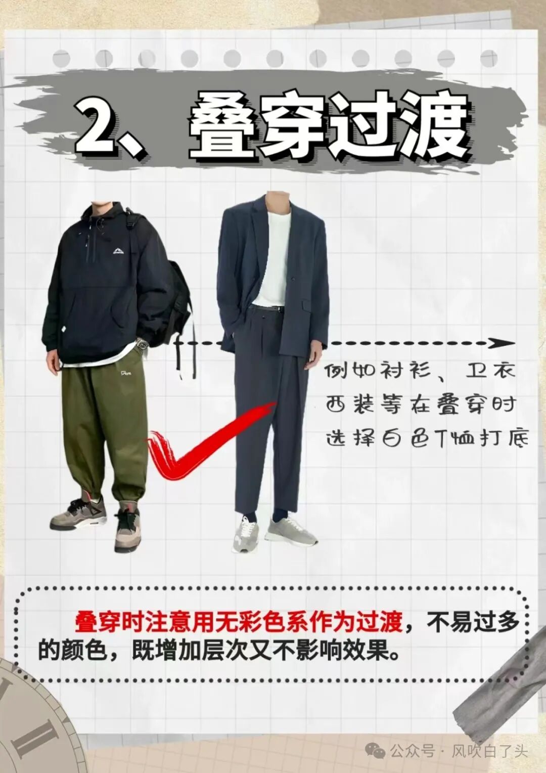 叠穿是一种时尚的穿搭方式,对于小个子男生来说也是提升衣品的秘诀。通过合理地搭配不同层次的衣服,可以营造出更加丰富的层次感。例如,在短款外套里面搭配一件长袖T恤,再配一条宽松的裤子,这样可以营造出更加高挑的视觉效果。