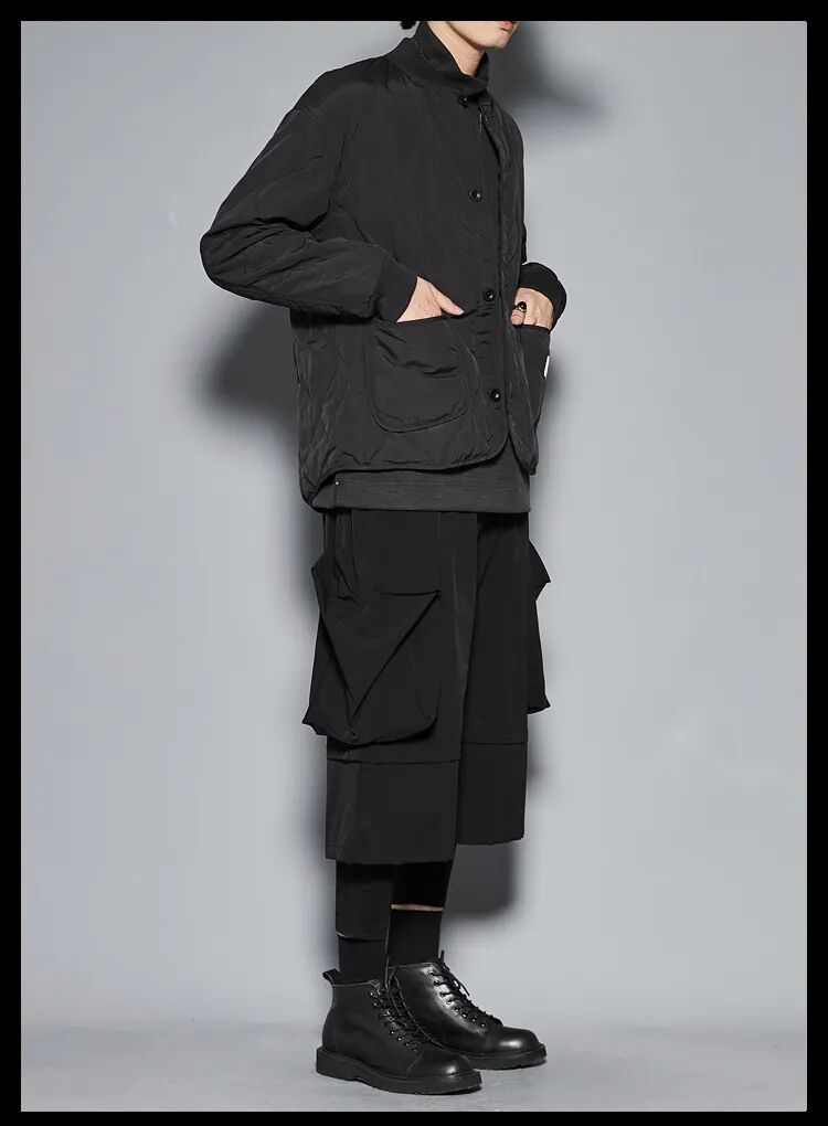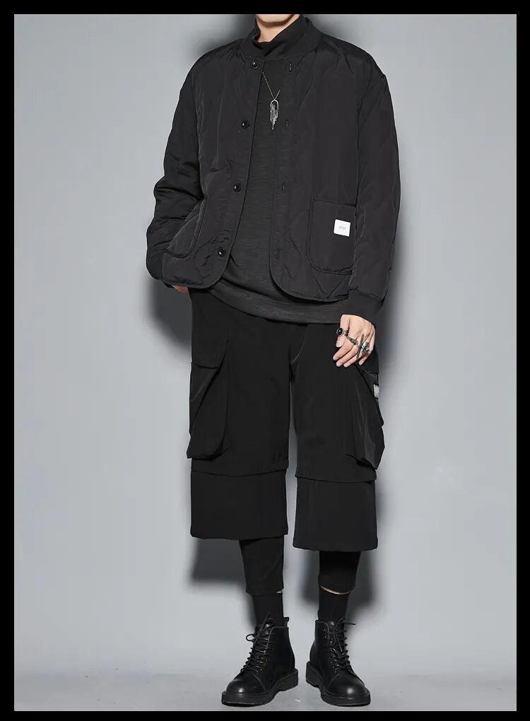 上装:黑色高领衫 黑色薄款棉服夹克