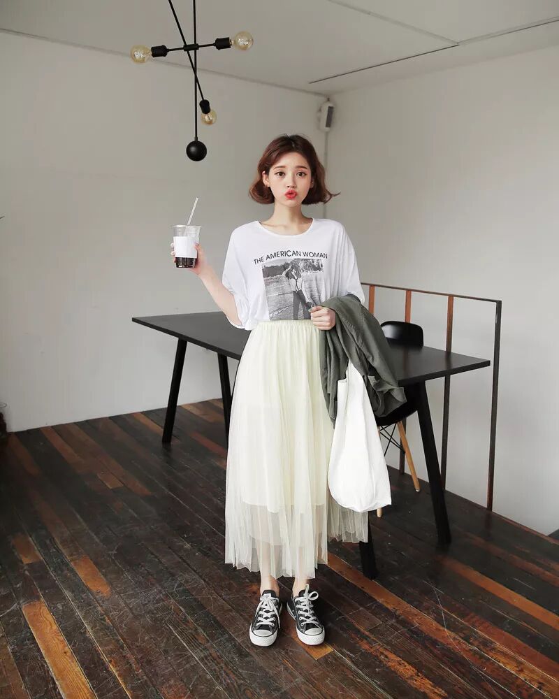 喜欢穿裙子的女生怎么办?最百搭的非A字裙莫属。A字裙的收腰以及开阔的下摆设计,完全就是为了微胖女生而准备的。上衣搭配一件印花T恤,很有层次感,显瘦还显高哦。