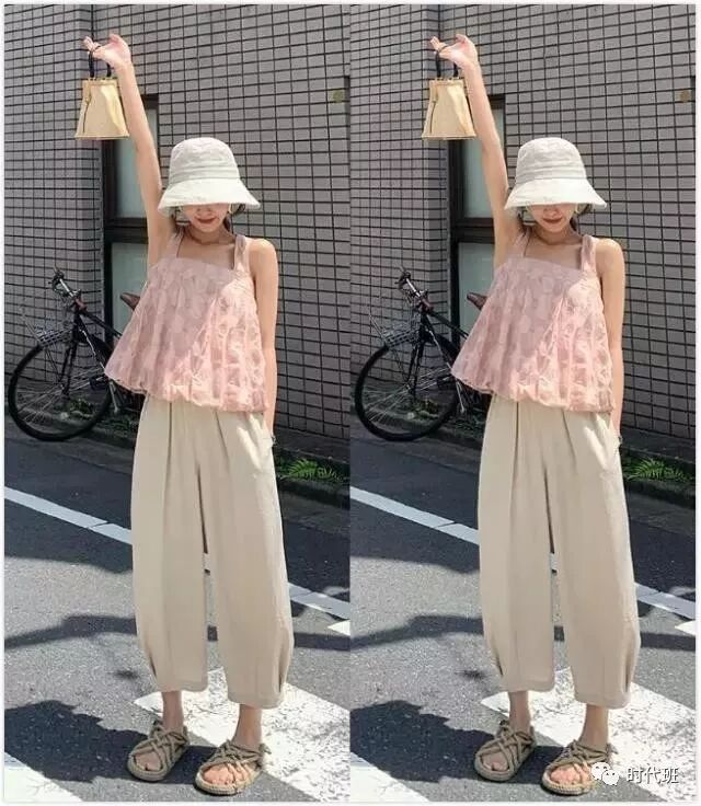 宽松版型的九分休闲裤在夏天可时髦可休闲可甜美,全靠你发挥想象力去搭配,这样裤子整体版型比较简约,但很时髦洋气,柔和的奶杏色在夏天穿搭很清爽。