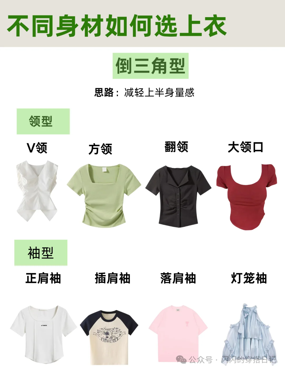 倒三角形身材的女生上半身较为宽阔,下半身较为纤细。穿搭时应尽量减轻上半身的量感,避免过于复杂的设计和图案。露肩上衣和吊带长T恤都是不错的选择,它们能展现出你的性感和活力。