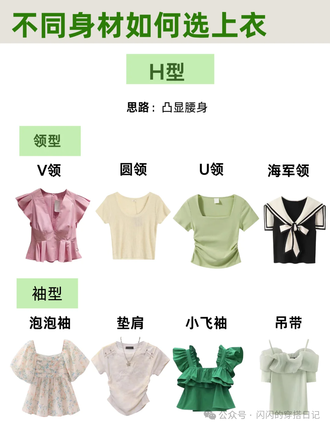 H型身材的女生上下身宽度相近,缺乏明显的曲线。穿搭时,应尽量打造出身材的曲线美,或者选择中性风格的穿搭。泡泡袖上衣和收腰外套都是不错的选择,它们能为你的身材增添一些层次感。同时,尝试一些带有时尚元素的单品,如流苏、蕾丝等,也能为你的穿搭增添亮点。