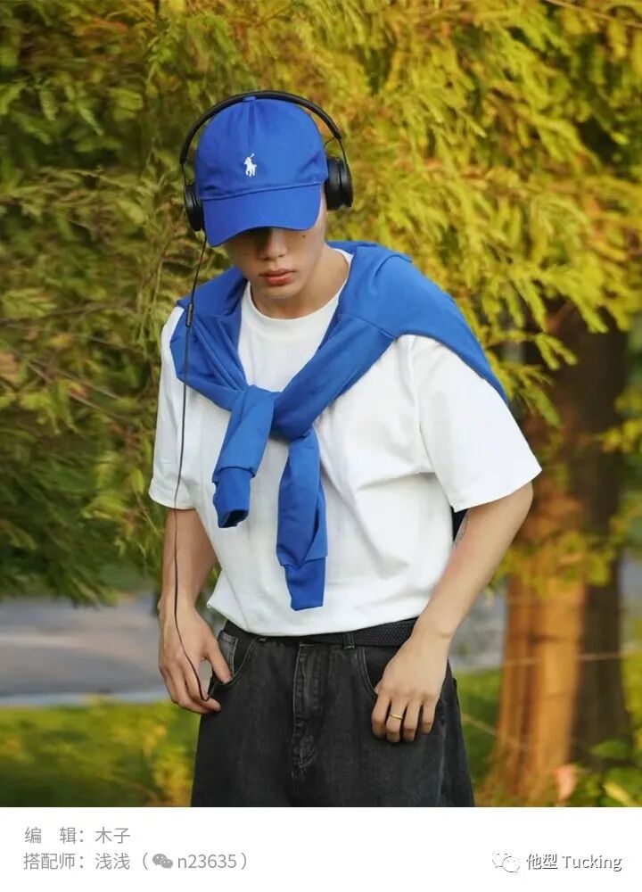 白色T恤搭配大火的克莱因蓝棒球帽打破沉闷感,清爽干净。