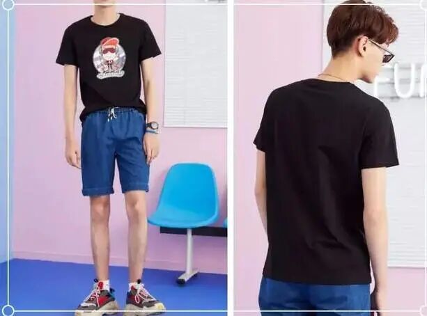 男生在夏季中的穿搭诀窍最注重的就是简单干净,常见百搭的黑色T恤,不挑人穿的单品跟蓝色的短裤搭配,上身马上就会有一种不一样的清爽感觉,看起来不仅干净整洁,而且还会凹凸出一种简单又不失帅气的既视感,很有韩范时尚男生的气息。