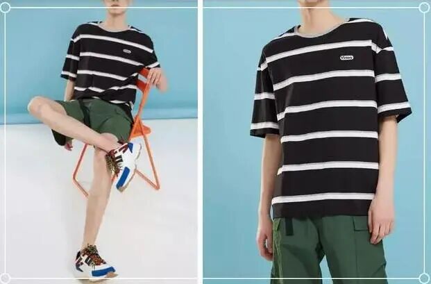 条纹T恤既可搭配长裤也可以搭配一些有着比较经典颜色的短裤,像这组上衣就是经典的条纹T恤,宽松的版型,时尚的男生们穿上会显得休闲感满满的,下身的搭配上就是军绿色的短裤,这样上下身都会呈现休闲随性的感觉,这组搭配示范最适合一些潮流男生尝试。
