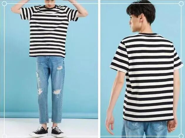条纹一直都是最经典流行的元素,由于它会给人一种很强的视觉冲击力,所以会给人一种清爽干净的感觉,常见的条纹T恤跟破洞牛仔裤搭配,宽松的版型剪裁休闲又随意的组合,个性中又诠释出几分街头型男的率性气息,夏季男生这样搭配会显得很有范。