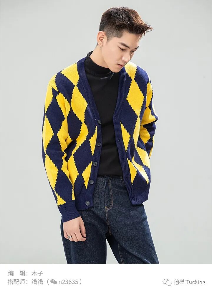 图中穿搭颜色一看就很亮眼,黄蓝对比配色有视觉冲击力,而且菱形格子图案让整体更有艺术画面感,比起纯色开衫显然这样的针织开衫会更有时尚气息。LOOK3:有些男生可能会比较反感运动装,认为运动装不得体不适合日常穿着。请搞清楚这点:运动装不是运动套装,并不是只有运动的时候才会穿得着运动装。运动装也是也可穿得很休闲的,看下图: