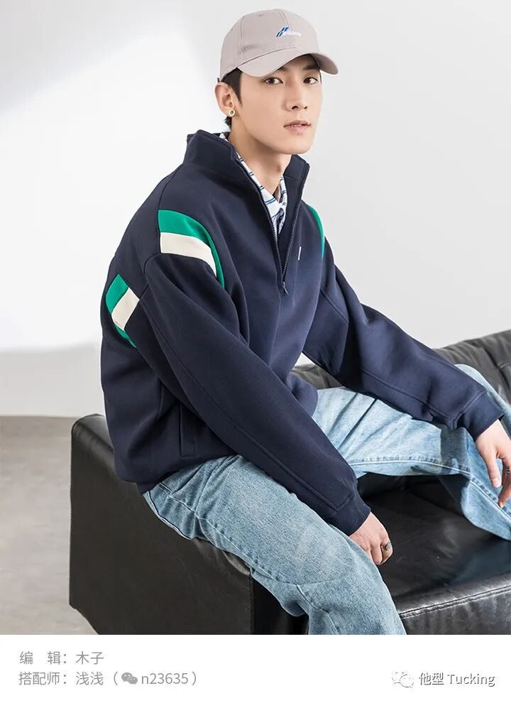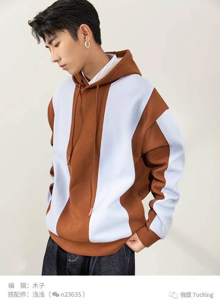 图中淡蓝色+棕色的大宽幅双色卫衣,视觉既时尚又复古,色彩碰撞鲜明,颜色一深一浅,一冷一暖,有对比又毫无违和感,里面可以内搭基本款T恤或者衬衫皆可。
