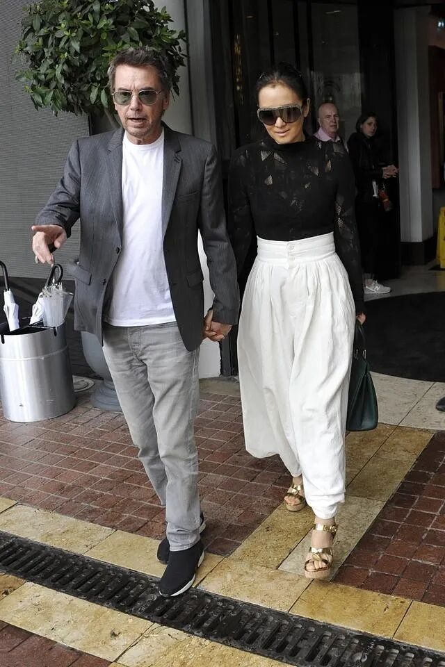 而身旁的老公,全身白色休闲装扮,一头银发散发着优雅与清爽,74岁的他无疑是“少年感”代名词。