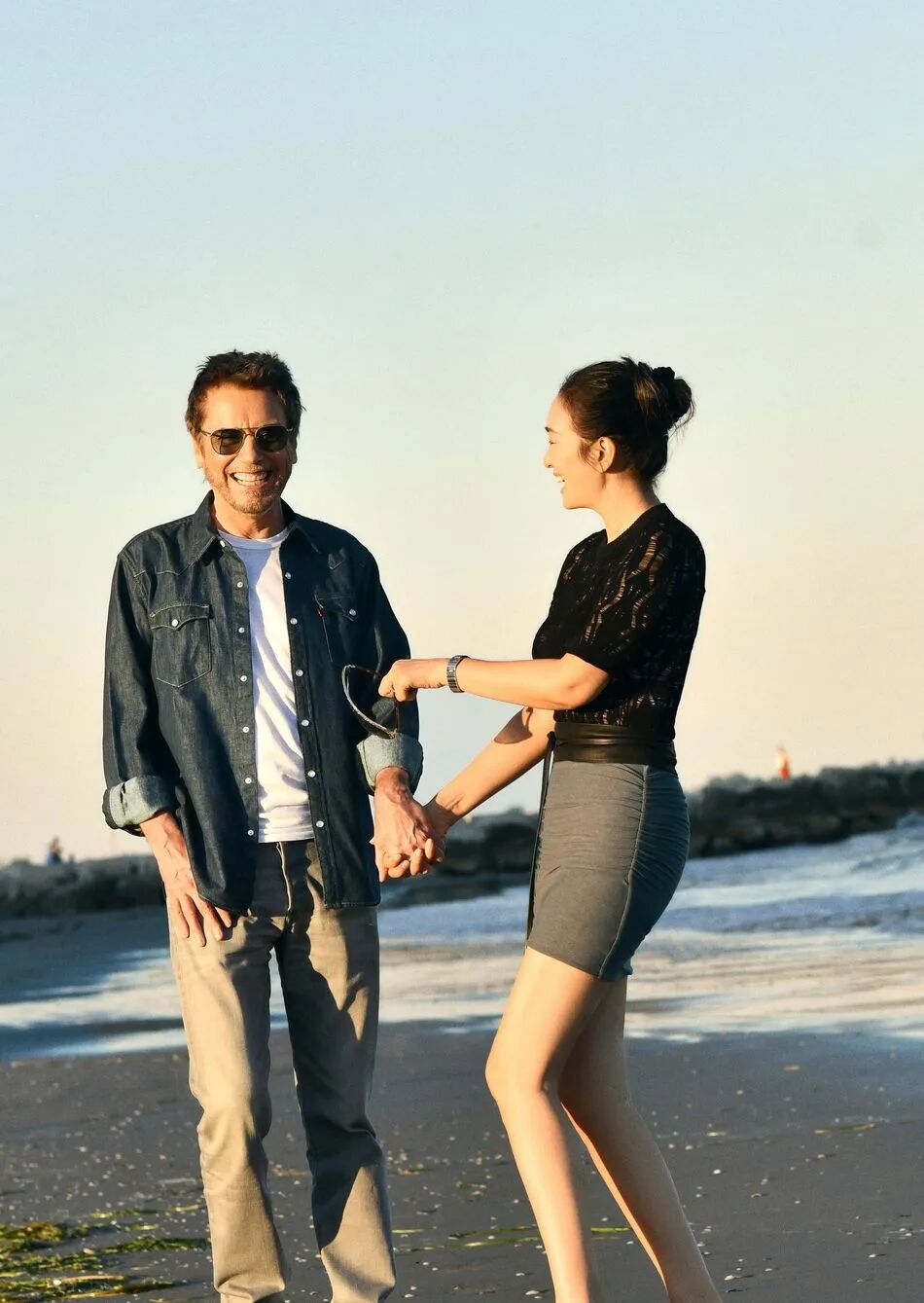 当天,他换上一条浅蓝色牛仔裤,搭配白色衬衫,整个人瞬间多了一种清爽的度假氛围。