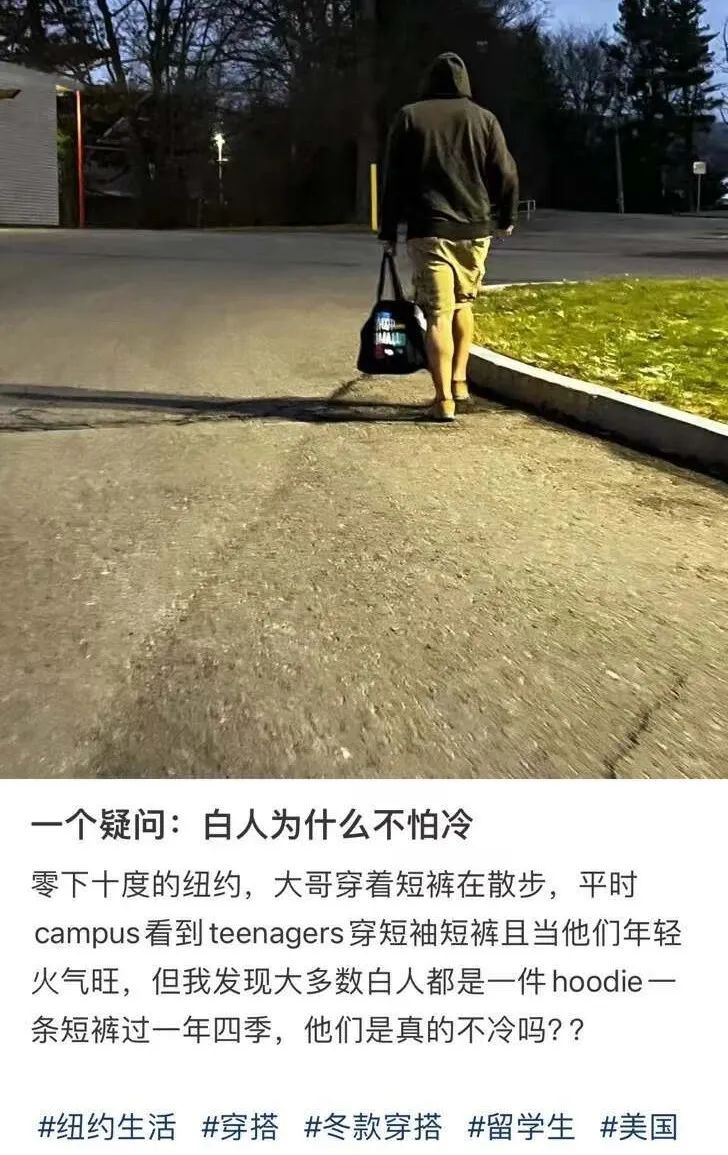 留学时间越久你就越会诧异——为什么白人男生可以零下都穿 hoodie +短裤。
