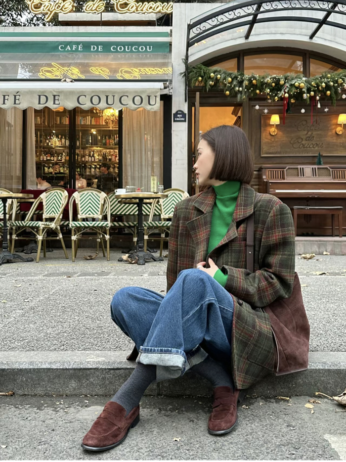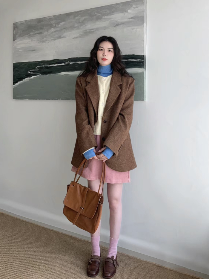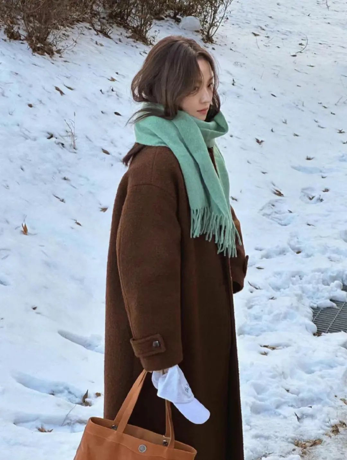 她姐比较推荐搭配选择“上绿下棕”的内搭搭配。套上自己衣柜里已经有的黑灰米棕大衣/羽绒服都不会违和。