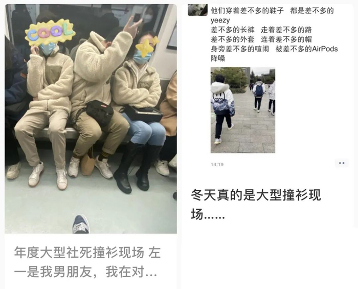 毕竟冬天的大件衣物都比较贵,清洗起来也麻烦,选择耐脏、经典的款式几乎是大家的共识,所以“撞衫”的概率自然也就很高~