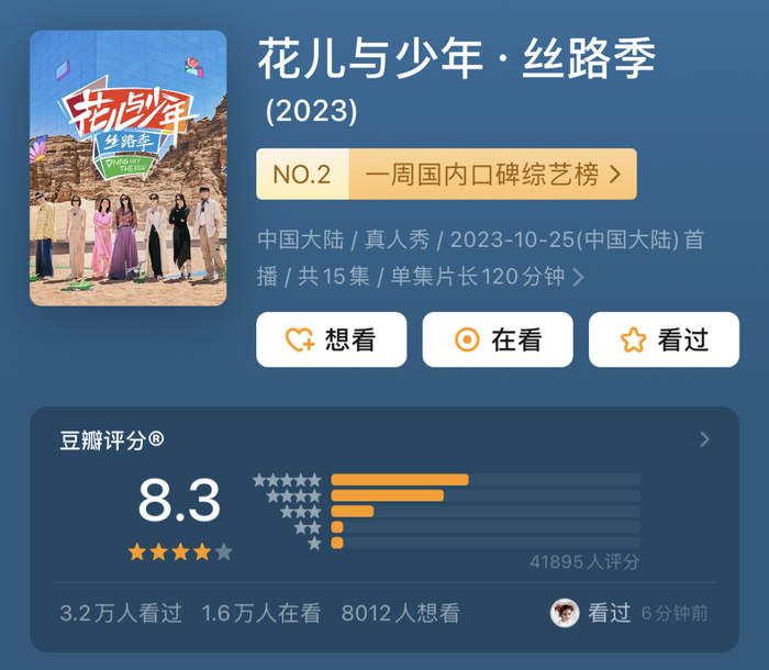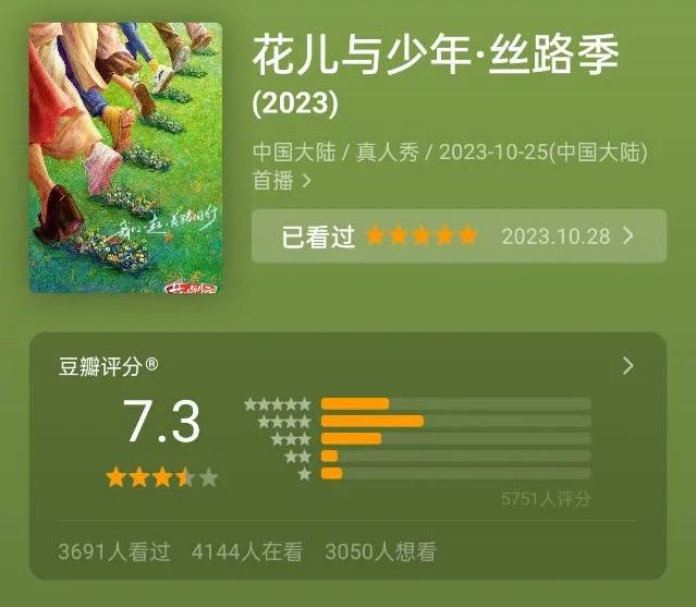 在综艺普遍越播评分越掉,新一季永远比不上上一季的大趋势下,《花少5》居然从豆瓣7.3的开分逆袭到了8.3分,并且超过了过往的全部4季评分。