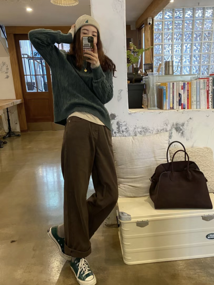 相信不少小伙伴在冬天都有购入棕色的裤装&裙装,和其他的不少颜色也很契合;绿色的上衣和白色单品也可以轻松再搭配,不会有“只能这么搭”的单一性问题。