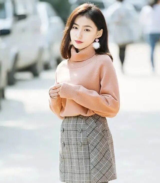 裸色的毛衣,穿在身上显气质又很减龄,虽然是纯色的,但是穿在身上不会显得人很老气,搭配一条半身裙,裙子是格纹的设计,灰白交织的格纹,穿在身上设计感很足,搭配上灰色的打底裤也是格外的好看,因为是加绒的设计,也不会让人觉得冷,穿上小皮鞋,很显高哦!