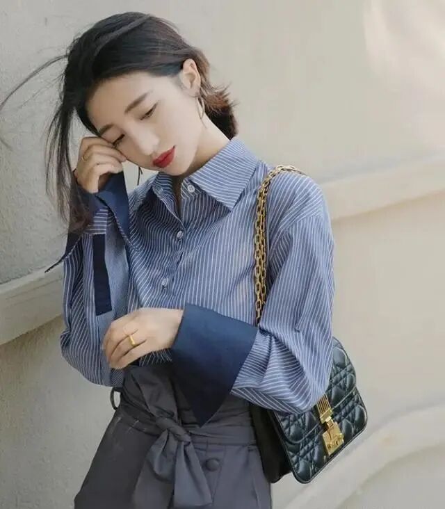 条纹衬衫,上身是蓝色的,因为是扣子的设计,脸有些微大的女人,穿着的时候,可以把上面的纽扣解开几颗,形成V领的样子,穿在身上显脸小,还很显瘦,搭配半身裙,裙子是系带的,灰色的裙子,穿在身上显气质,又很有少女心哦!背上一只链条的包,简单又耐看,轻松就让你拥有时髦感!