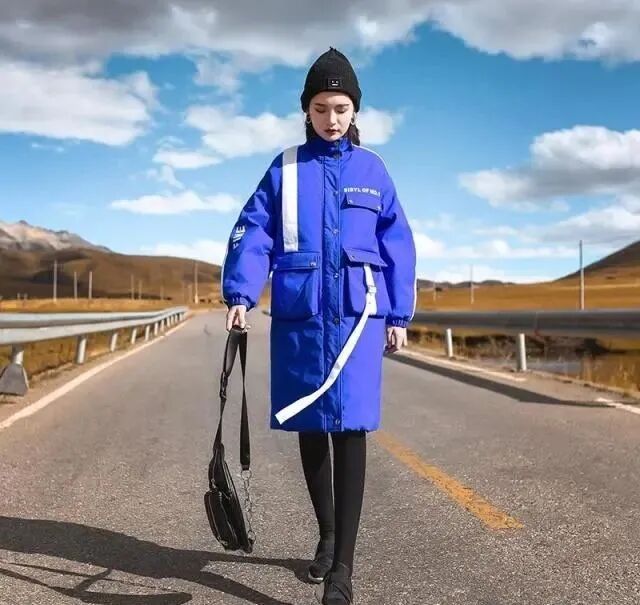 上身是比较宽松的羽绒服,蓝色的设计,穿在身上保暖,又很显气质呢,衣服上有很多白色线条的装饰,看起来设计感很足,再加上是高领的款式,保暖又不透风,搭配圆领毛衣在里面,或者穿上一件卫衣在里面都是可以的,穿上黑色的打底裤,裤子是内里加绒的,舒适又显气质,鞋子就穿一双平底鞋吧,小个子女人穿平底鞋,也是很有气势的哦!