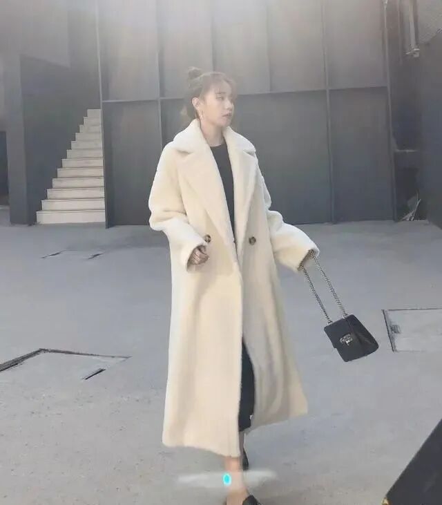 白色大衣,大衣是比较宽松的版型,穿在身上时尚又显气质,前面是有大圆扣的装饰,显得很大气,再加上大翻领,也是能够显得脸比较小的,再穿上一条黑色的针织裙,裙子是圆领的设计,看起来显瘦又很衬气质哦,搭配上一双平底鞋,简约又很百搭哦!小个子女人穿这身的时候,可以选择系上一条腰带,能很好地显示出腰身!