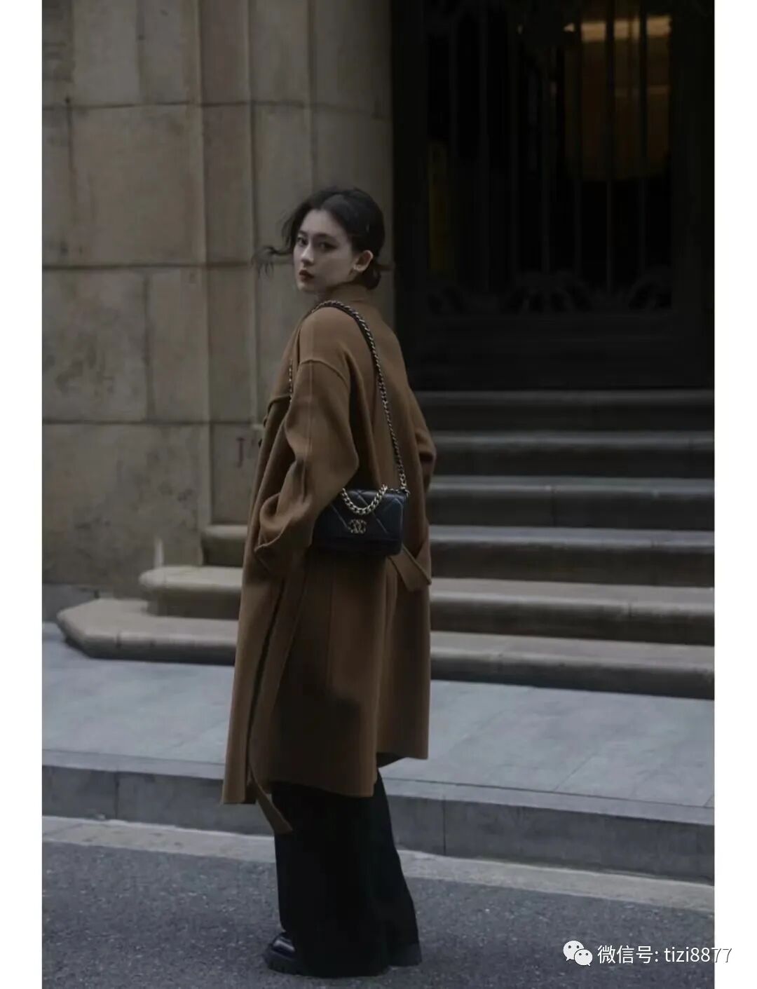 look1 驼色短大衣+黑色五分西裤