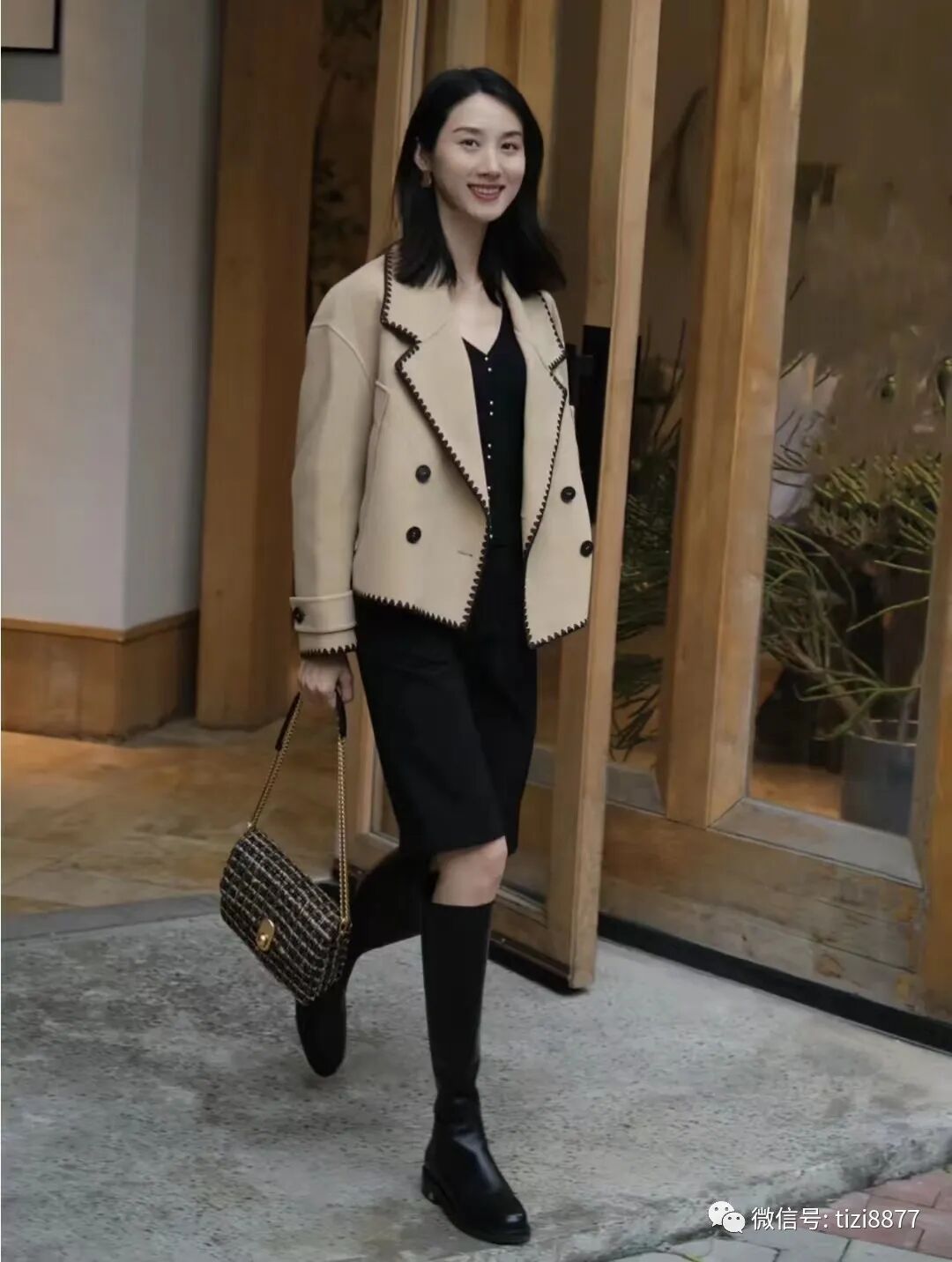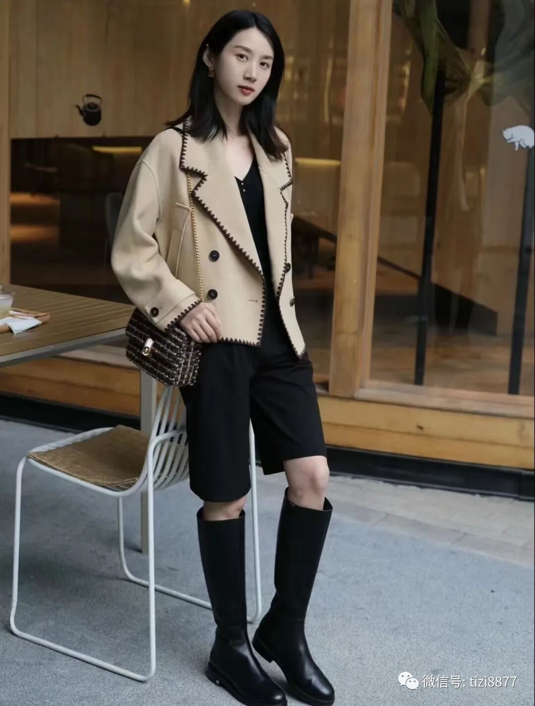 look5 驼色短大衣+高筒靴