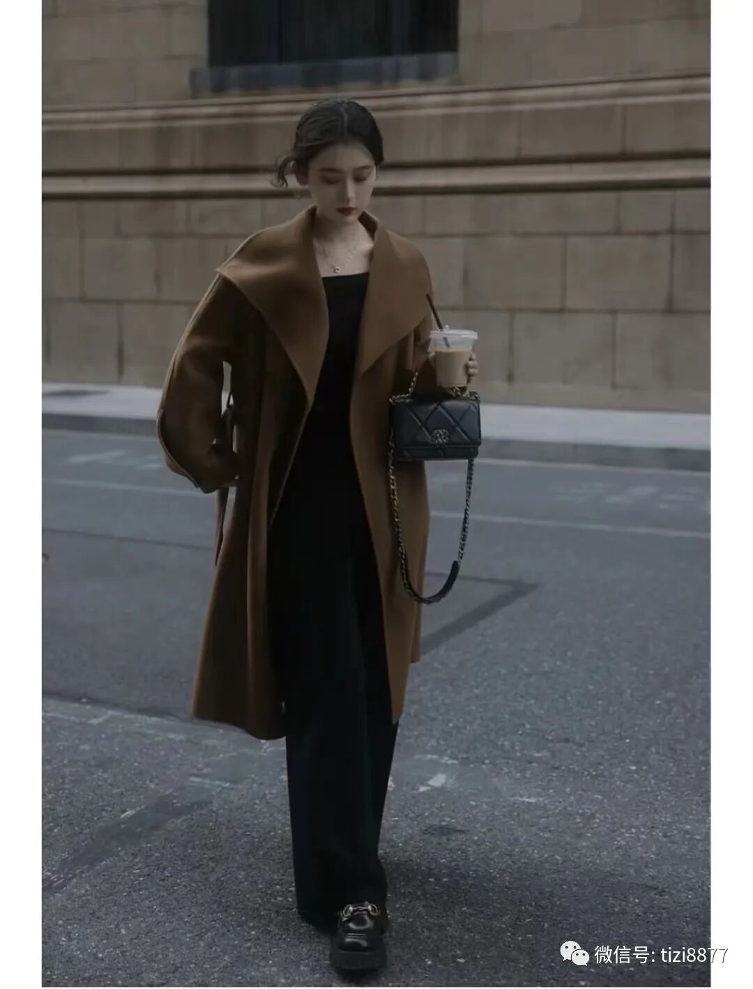 look23 驼色大衣+黑色连衣裙