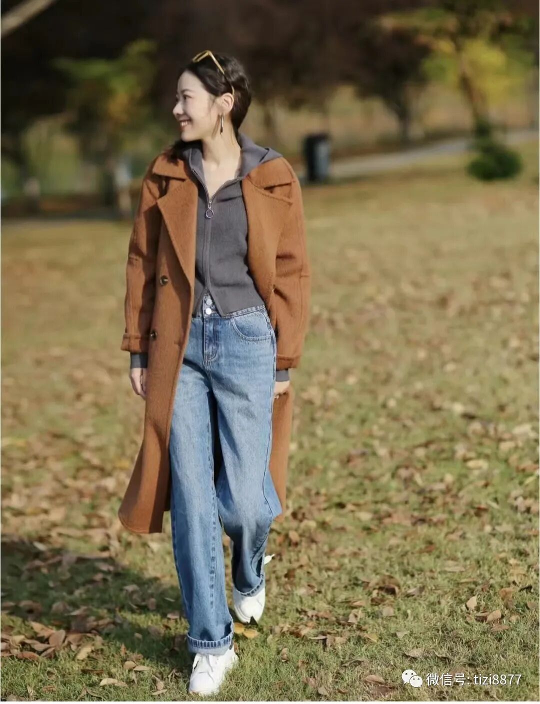 驼色大衣搭配灰色帽衫和牛仔裤有种法式随性慵懒范~~