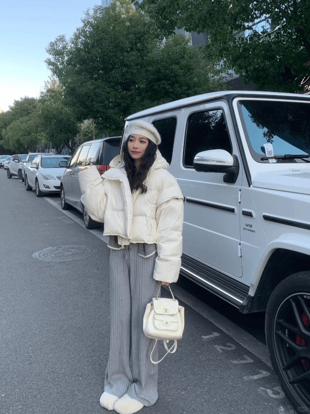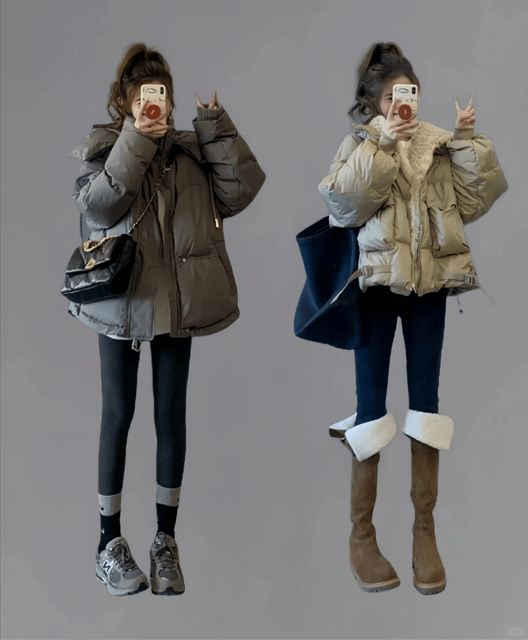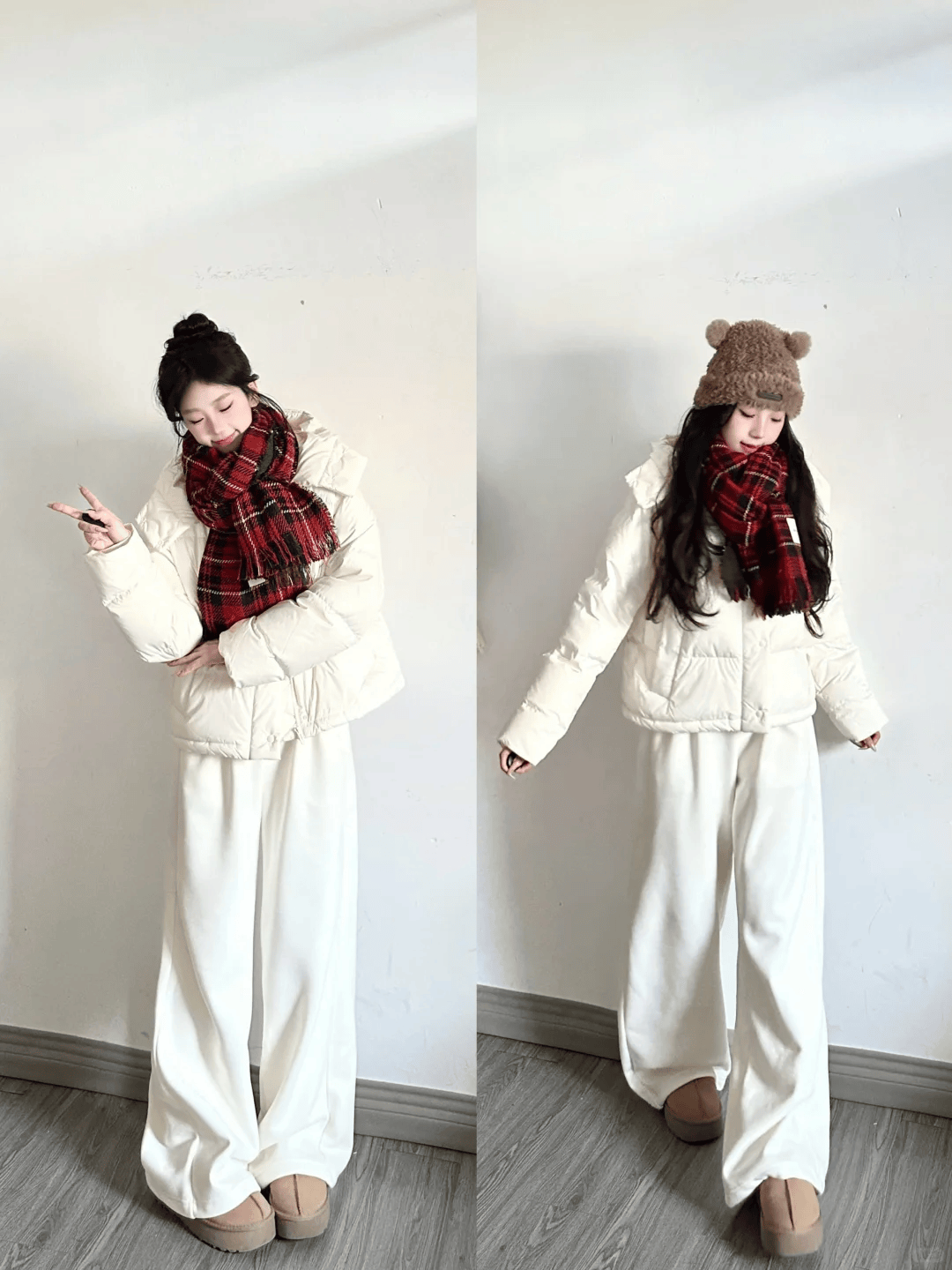 米白色羽绒服+冷白色阔腿裤:米白色羽绒服以其温柔的气息,赢得了众多女性的喜爱。搭配一条冷白色的阔腿裤,不仅保持了整体色调的和谐统一,还通过阔腿裤的版型设计,巧妙地修饰了腿部线条,让整个穿搭看起来既优雅又不失亲和力。